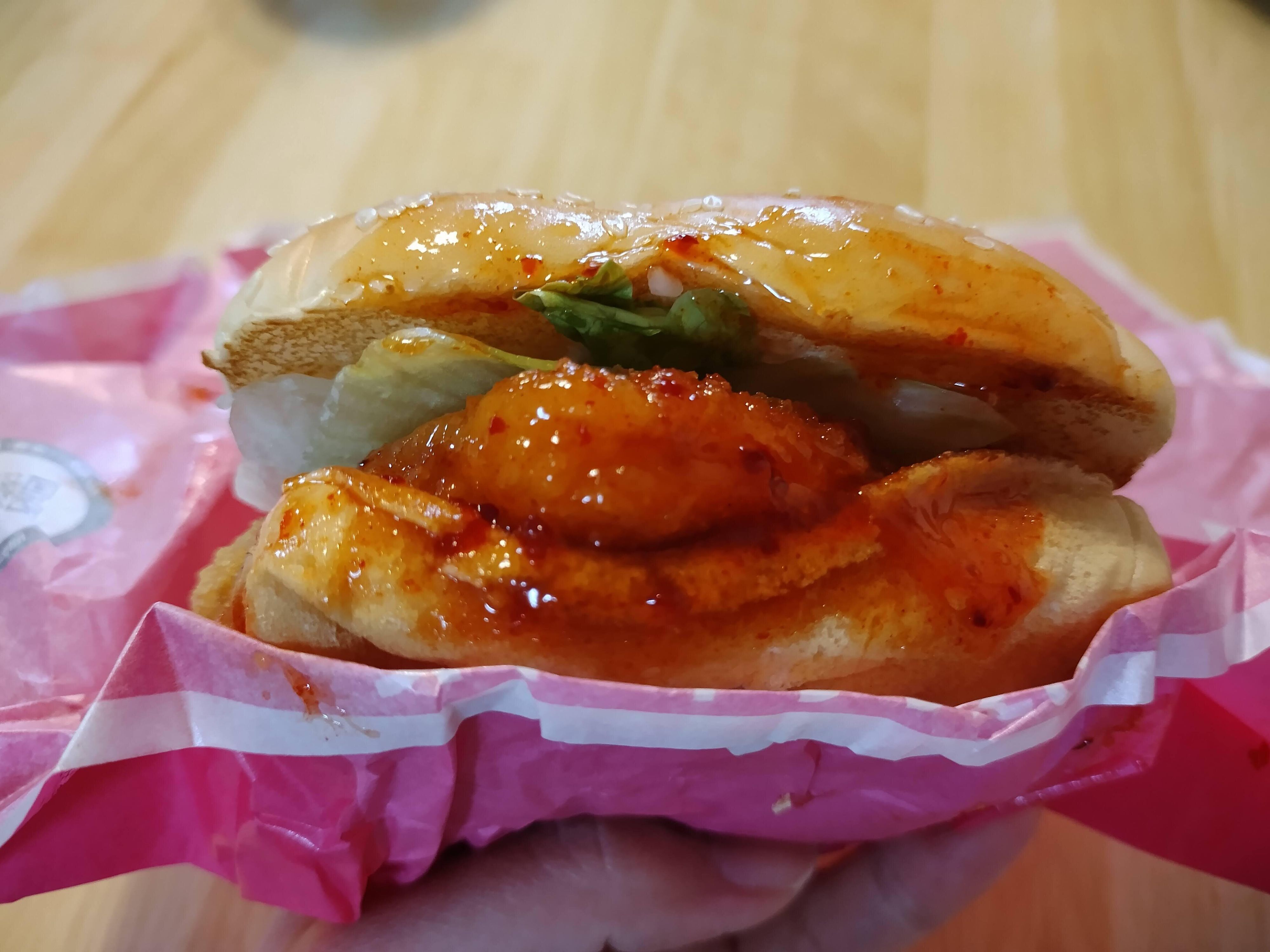続いて2006年に発売され、今回リニューアルして販売されている「スイートチリ えびフィレオ」。具体的な変更点はホームページには記載されていないのですが、こちらも「アイコンチキン ソルト&レモン」と同様の四角いでこぼこバンズが使用されています。メインのえびカツにレタス、オニオンに2種類のソースがサンドされています。