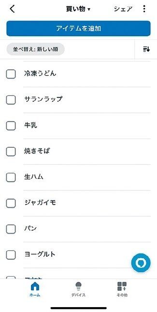思い付いたときに「アレクサ、買い物リストに〇〇入れて」と呼びかければOK。Amazon Alexaアプリにリスト化されるので、買い物がスムーズ。