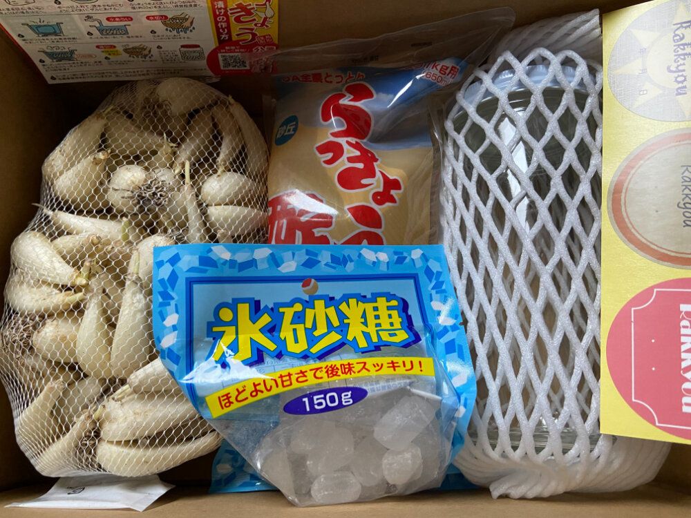 らっきょう酢、漬ける瓶、お好みで使う氷砂糖、ラベルシールに説明書が同梱されていました。