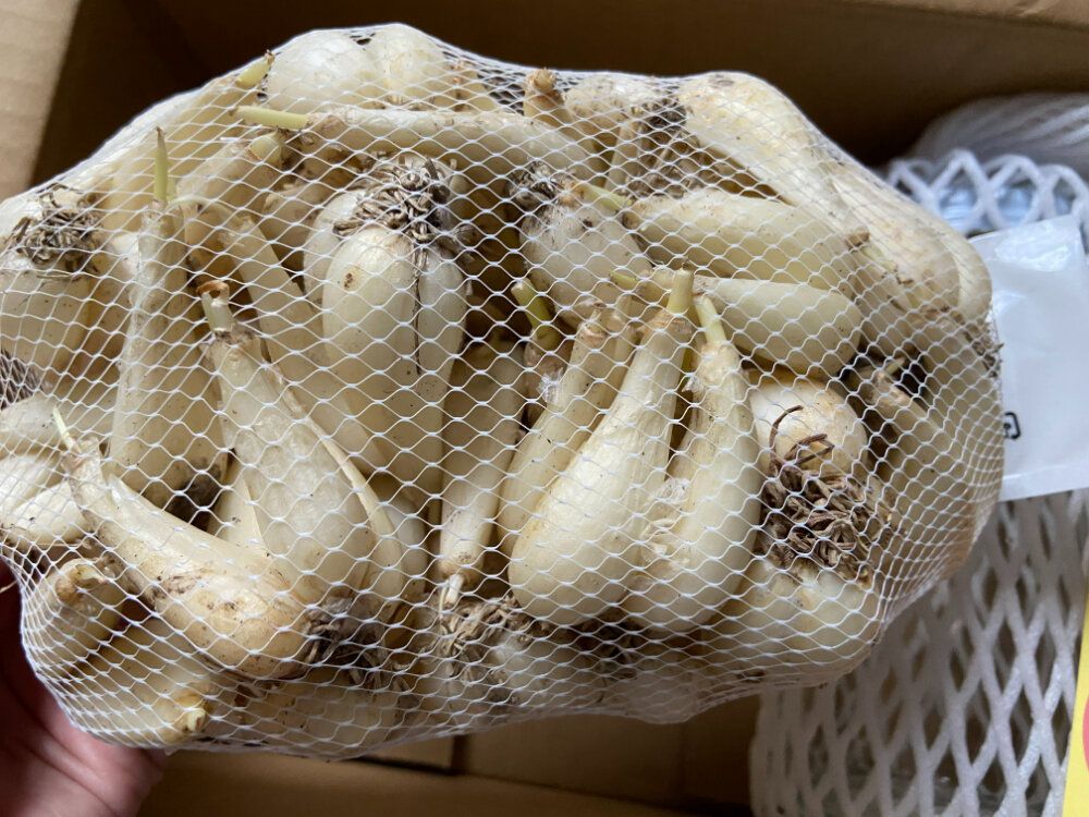 ネットに入ったたっぷりのらっきょうは、茎と根がついている状態。筆者はこの状態のらっきょうを初めてみました。にんにくに似ていますね。