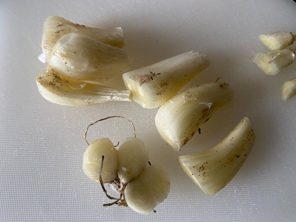 まずはらっきょうの茎と根を切り落とします。カットを続けているうちに目が少し痛くなってきました。玉ねぎのみじん切りをしている時に目が痛むものと同じ成分が入っているそう。