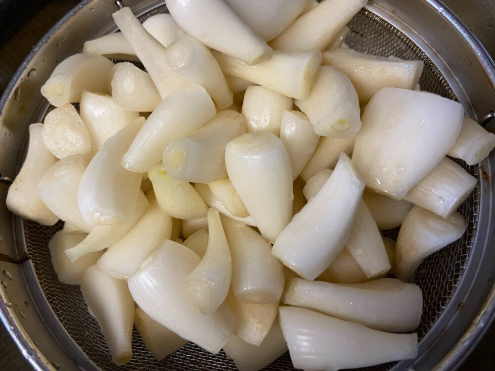 ちなみに、らっきょうが瓶に入りきらず余ったので、洗って薄皮が取れたものをごま油・塩コショウで炒めてみました。新感覚のらっきょう!手が止まらなくなるおいしさでした。