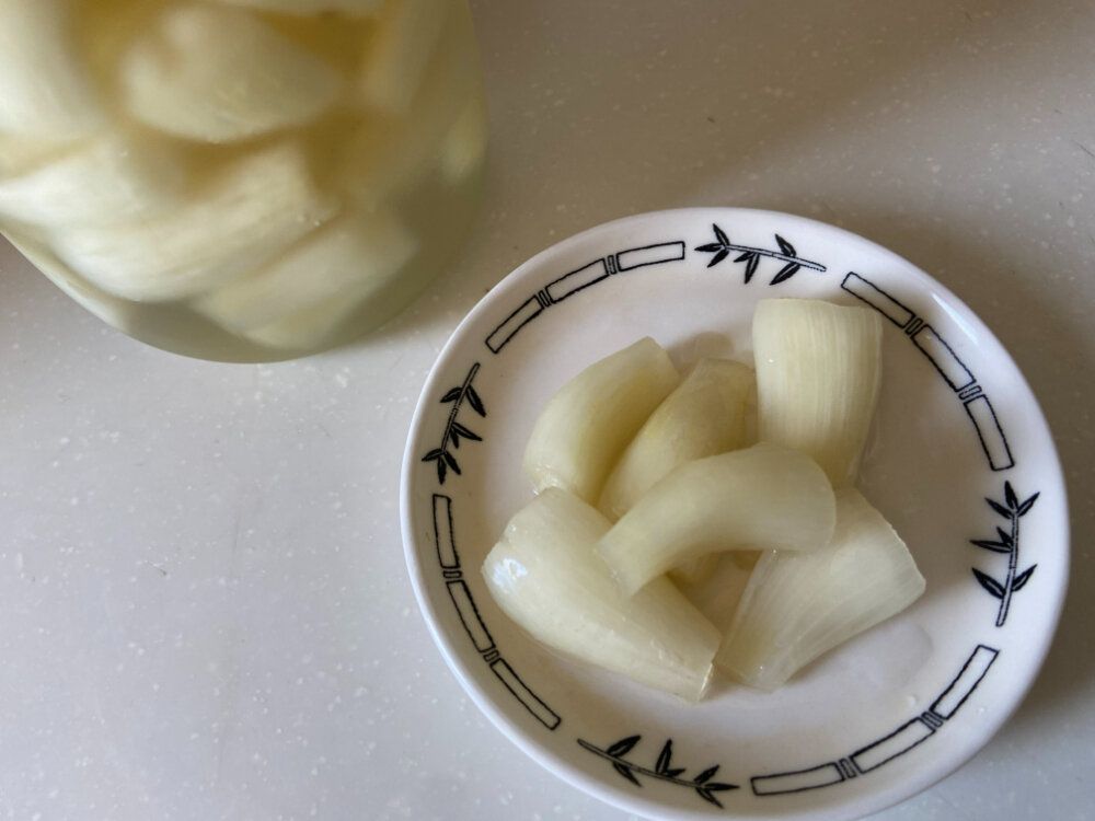 シャリシャリとした歯触りがとても心地良いですね。甘酢もしみ込んでいてさっぱり爽やかでおいしいです。1か月後のらっきょう漬けの味も気になるのでそれまで楽しみに待とうと思います。