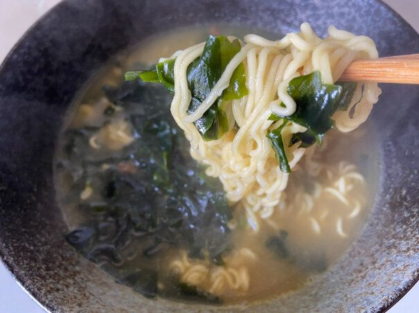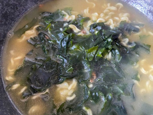 まずスープを飲んでみると、あっさりとした味わいの中にわかめの風味と旨みが感じられてとってもおいしいです。韓国の麺なので辛みもあるのかなと思ったら、まったく辛くありませんでした。