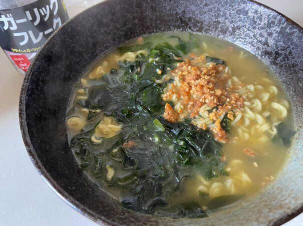 業務スーパーマニアでもある筆者が常備している、「ガーリックフレーク」をトッピングしてみたら相性抜群でさらにおいしくなりました。