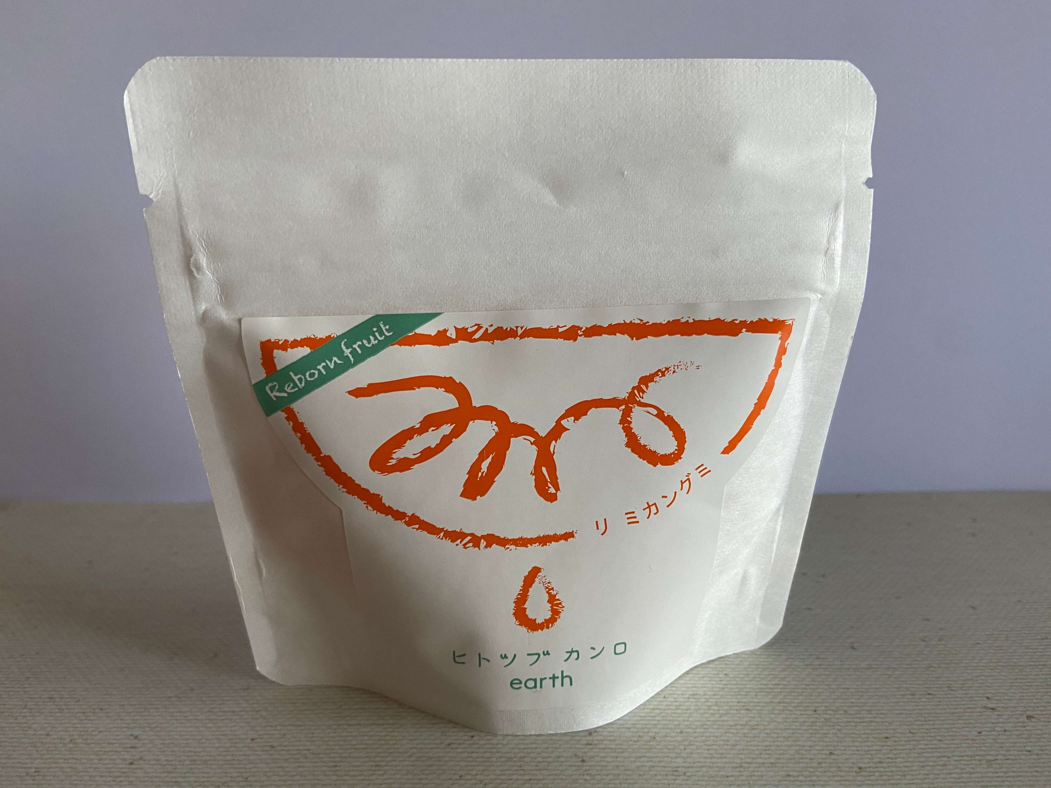 このグミの特徴は、国産の清見みかんを搾った時に残る繊維質「清見パルプ」と「清見みかん」の果汁を使用しているそうで、搾りかすから作られた環境にもやさしく素材の味を活かしたグミになっているとのこと。