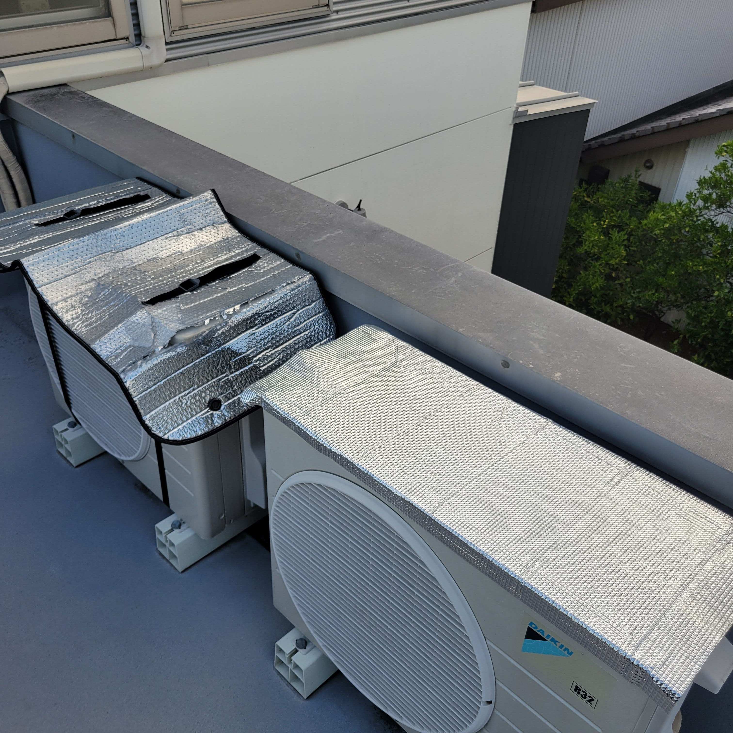 左側の室外機の日よけシート。頂いたものですが、1000円以上はすると聞いていたので長く使えると思っていましたが、すでに破れていました。