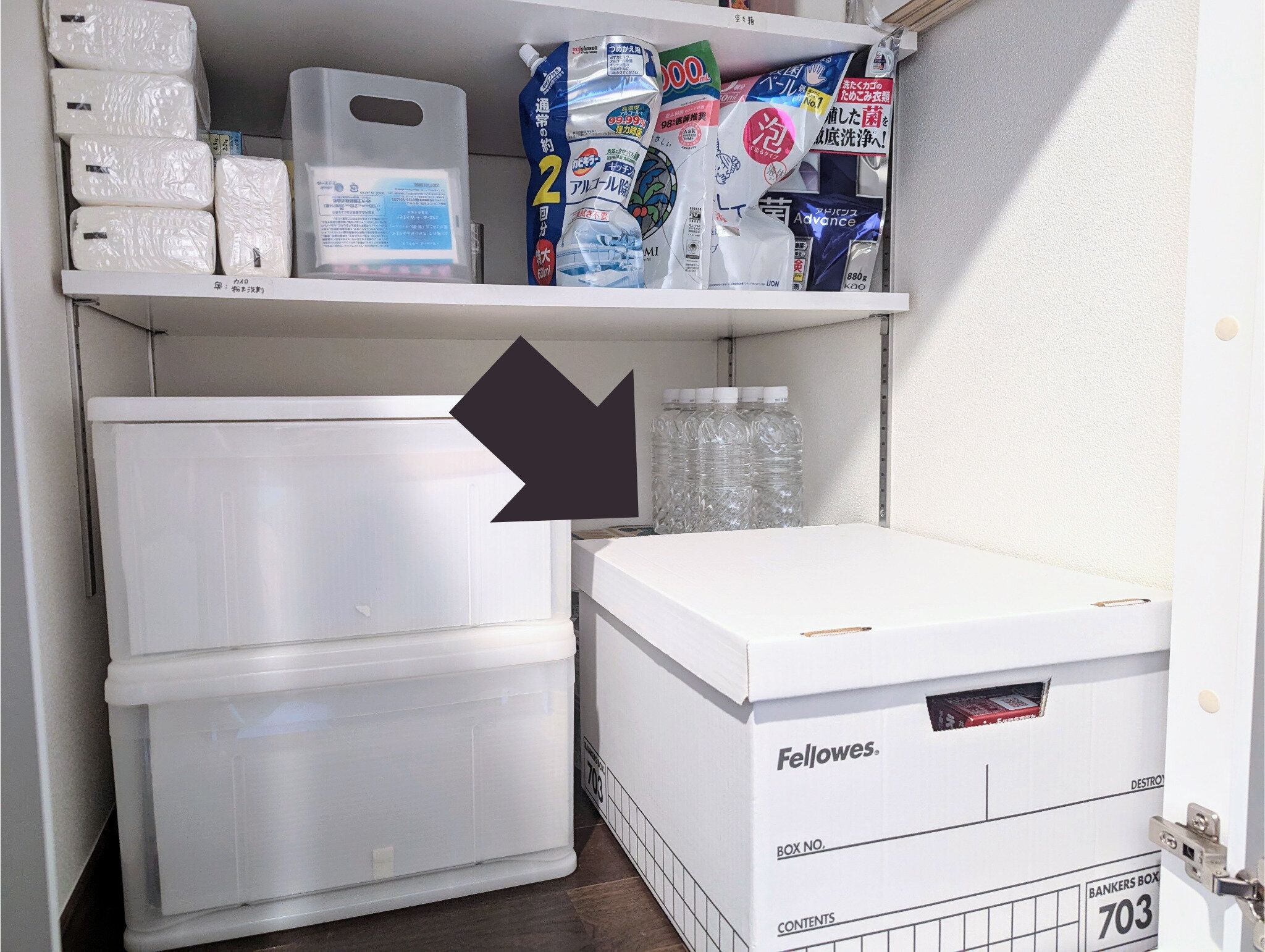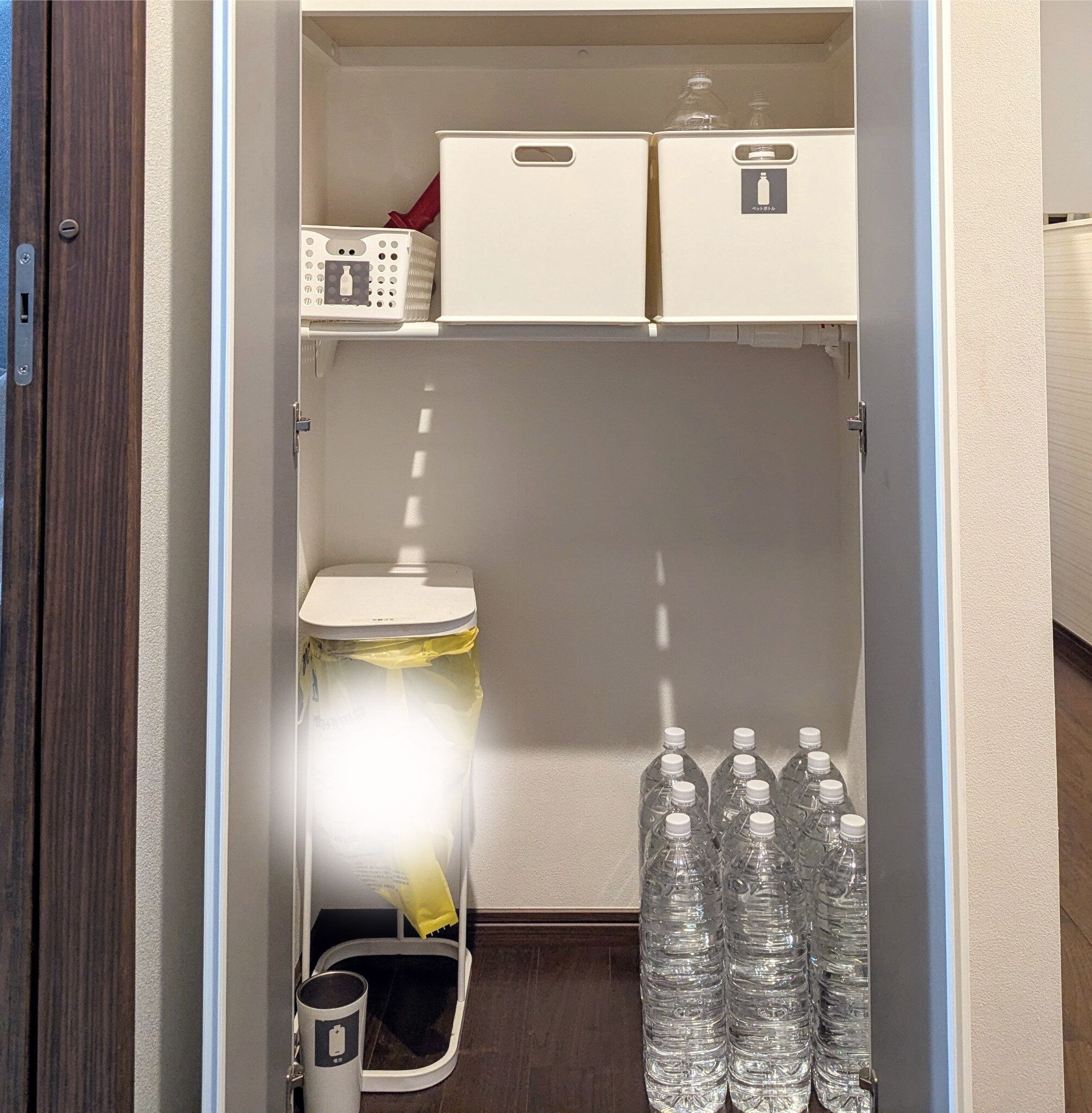 自宅は2階建て2世帯住宅のワンフロアのため、収納スペースには限りがありますが、分散収納することで置き場問題を解決しました。2Lボトル2箱分(12本)は廊下収納に、500mlボトル1箱分(24本)はパントリー代わりの収納に。これで合計36L。