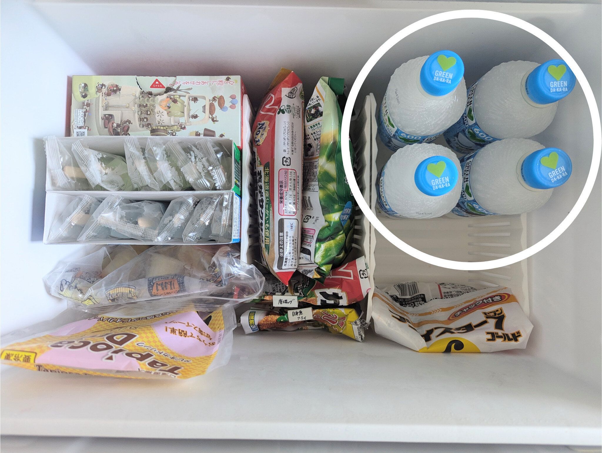 対策として常備しているもののひとつが凍結ボトル。コンビニやスーパーで買える冷凍OKのペットボトル飲料を、冷凍庫に数本ストックしています。災害時には保冷剤代わりに使えて、解凍すればそのまま飲むこともできるので一石二鳥。スポーツドリンクを選べば、水分と一緒に塩分も補給できて安心です。