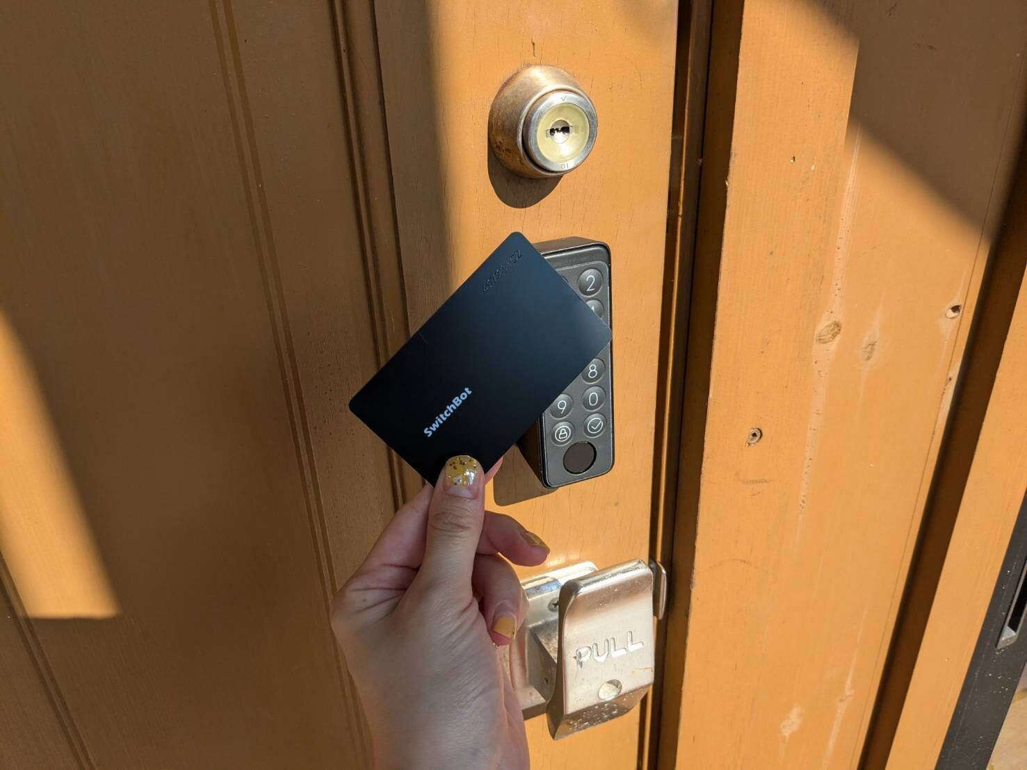 後付けスマートキーと聞くと、機能が劣るイメージがあるかもしれませんが、侮るなかれ!『SwitchBot』は「指紋」、「パスワード」、「カード」の3つの解錠方法が選べます。中でも筆者が最もよく使うのが、指紋解錠。100種類の指紋を登録できるので、家族全員10本の指すべてを登録することもできます。
