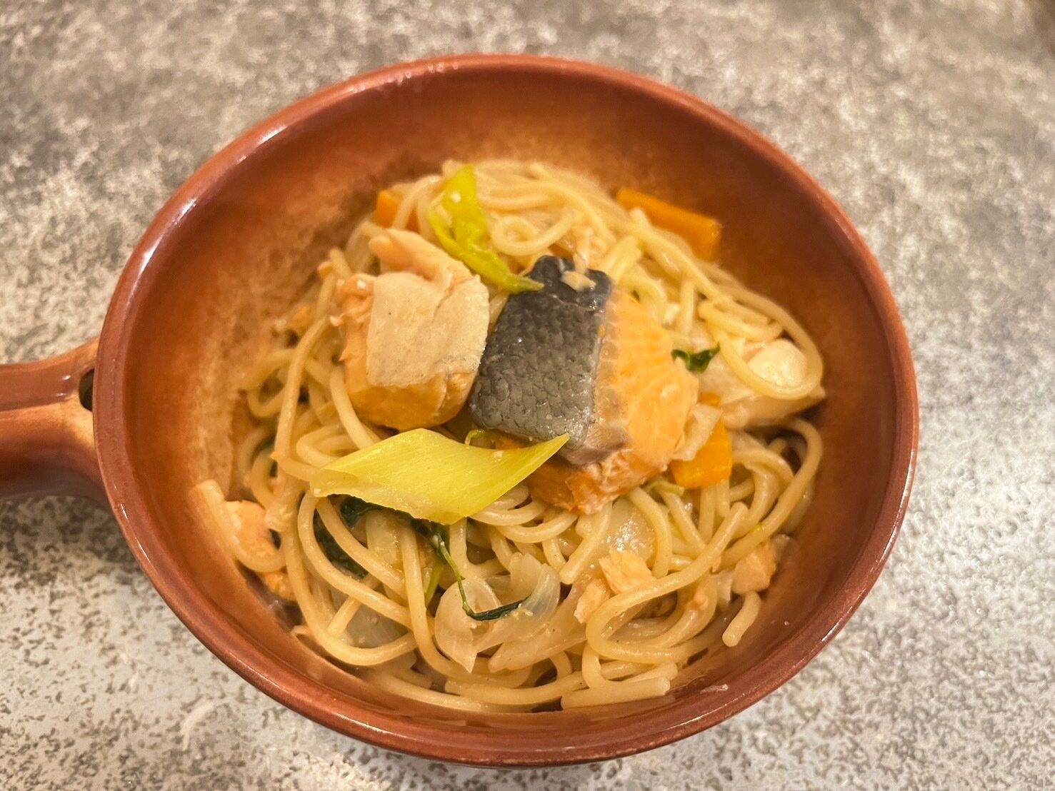 今回は家にあった鮭を使って作ってみましたが、和風なので魚とも相性抜群です!野菜もたっぷり入れましたが、具材を多めにしても味がぼやけるといったこともなく割と濃いめの味付けです。