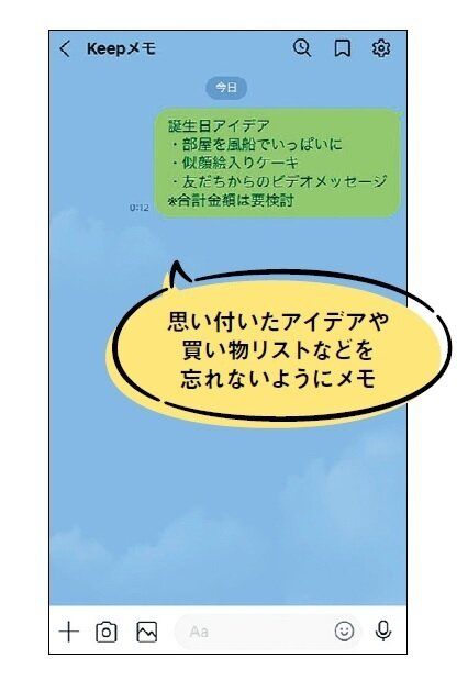 実は、自分専用のトークルームを作成することが可能。その名も「Keepメモ」。トークルーム上部の検索窓から「Keepメモ」と検索して開き、通常のトーク同様にメモしたい内容を送信すればOK。さらに下記のやり方でトーク上部に固定すると、使いやすい。
