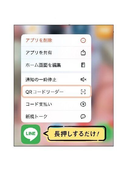 急な連絡先交換に、あたふたした経験がある人必見!スマホのホーム画面のLINEアイコンを長押しすれば、〔QRコードリーダー〕が出現。他にも長押しでコード支払いや通知の一時停止なども表示されるので、便利! *iPhoneの仕様で、Androidと多少異なります。