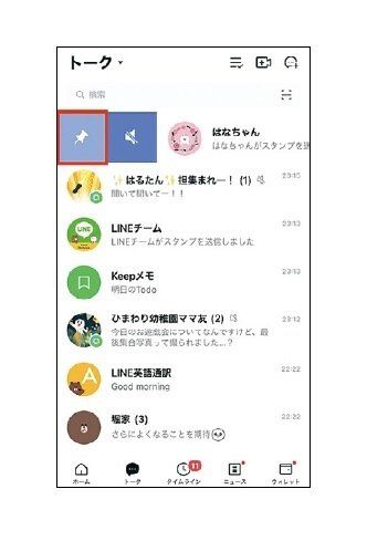 トークリストの上部に固定表示するには、ピン留めしたい人のトークルームを右側にスワイプし、〔ピン留めマーク〕をタップ。よく連絡する家族や友達が、他のトークに紛れず即見つかる *iPhoneの仕様で、Androidと多少異なります。