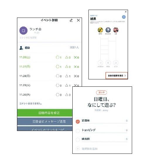 トークのグループメンバーに対し、いつにする?どの店にする?などをスムーズに聞ける機能も。方法は、トークルーム左下の〔+〕をタップ。〔日程調整〕または〔あみだくじ〕、〔投票〕を選び、テーマや選択肢を入力するだけ。