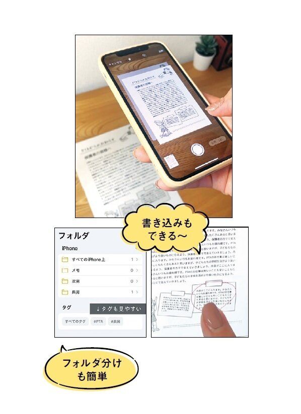 メモアプリを開き、新規メモを作成。下の〔カメラボタン〕→〔書類をスキャン〕をタップ。PDF化したいプリントなどにファインダーを合わせると自動的にスキャンして(複数枚もOK)、保存できる。保存後は下部の〔ペンマーク〕で書き込みしたり、右上の〔…〕から〔メモ移動〕を選べばフォルダ分けも可能。