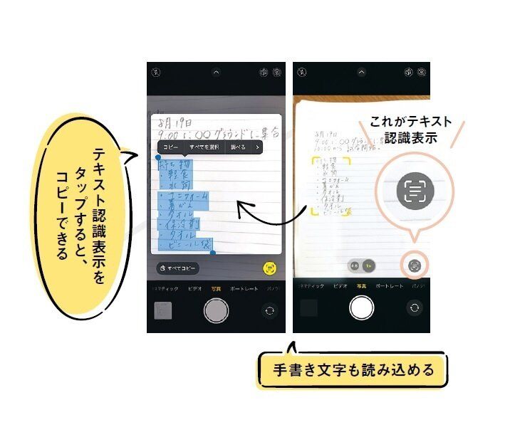 プリントや看板などの文字をテキスト化できる「テキスト認識表示」。カメラをかざし、マークが出れば読み取り可能。コピーしたり、翻訳することもできます。写真アプリのデータも読み取れます。