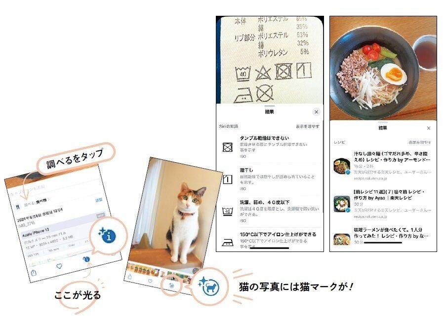 写真アプリ内の写真をタップし、下部の「i」マークにキラキラが付いていたら、画像が認識された合図。タップして〔調べる〕を押すと、レシピや動物・植物などの種類、場所、洗濯表示など、写真に関する情報が表示されます(iOS15以上が対応)。