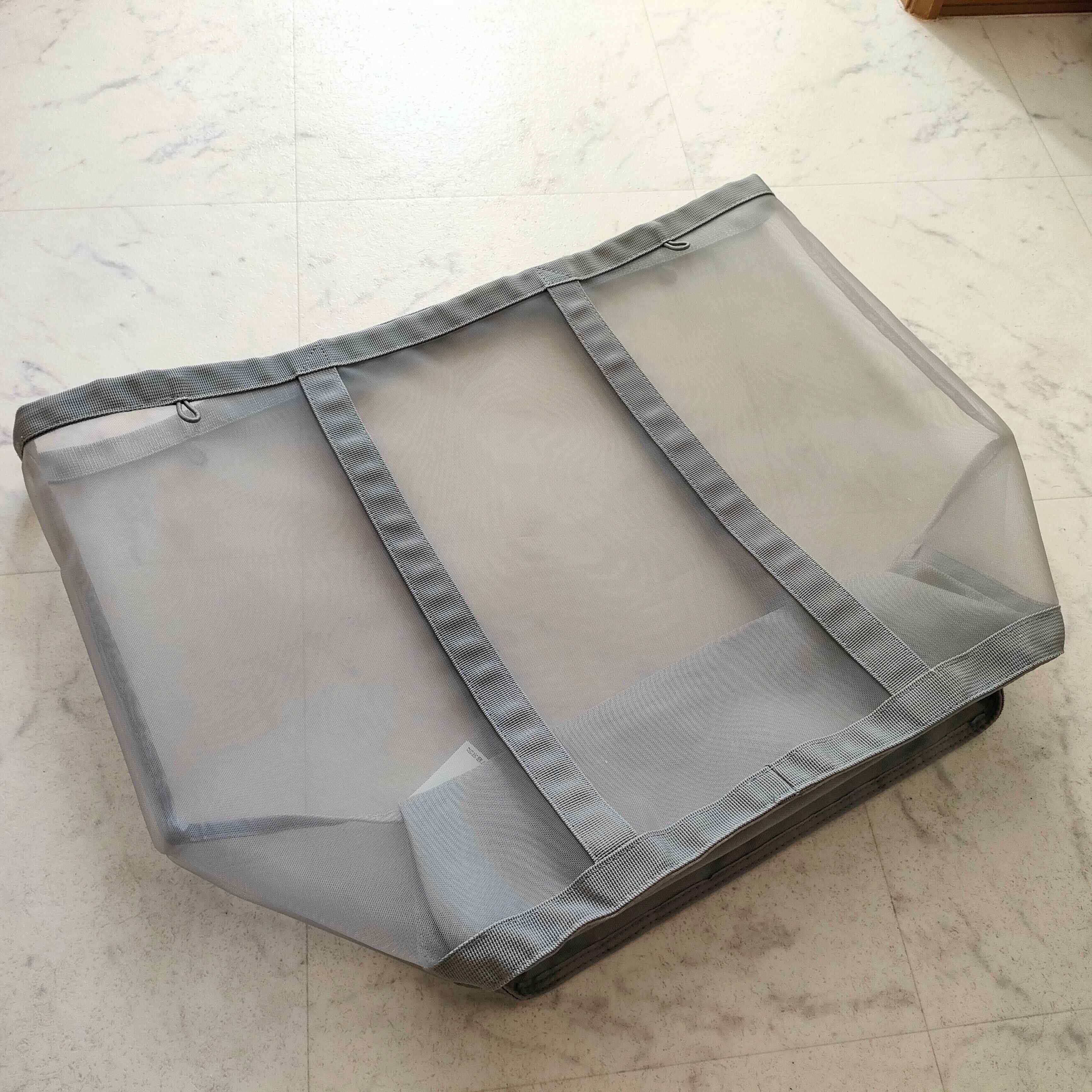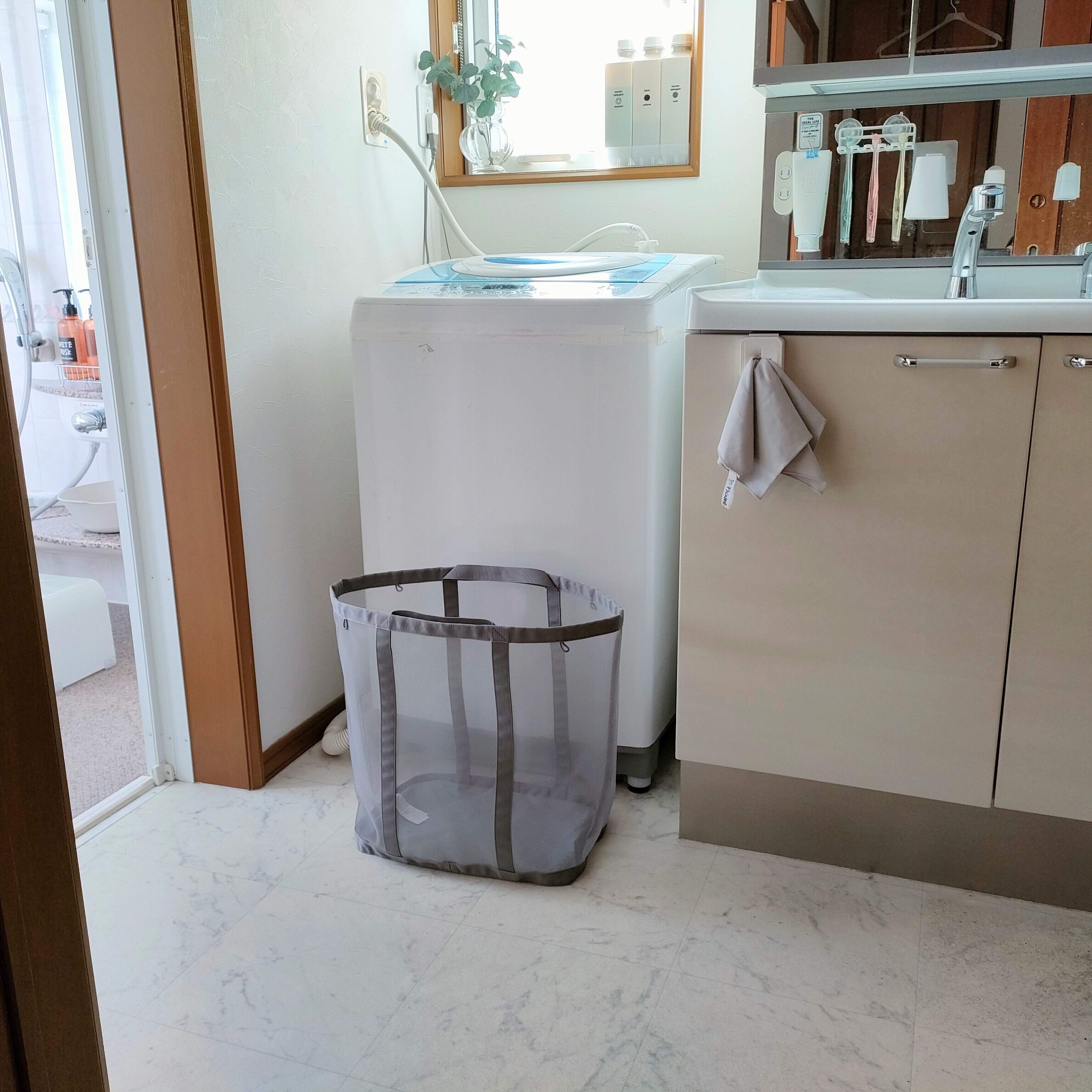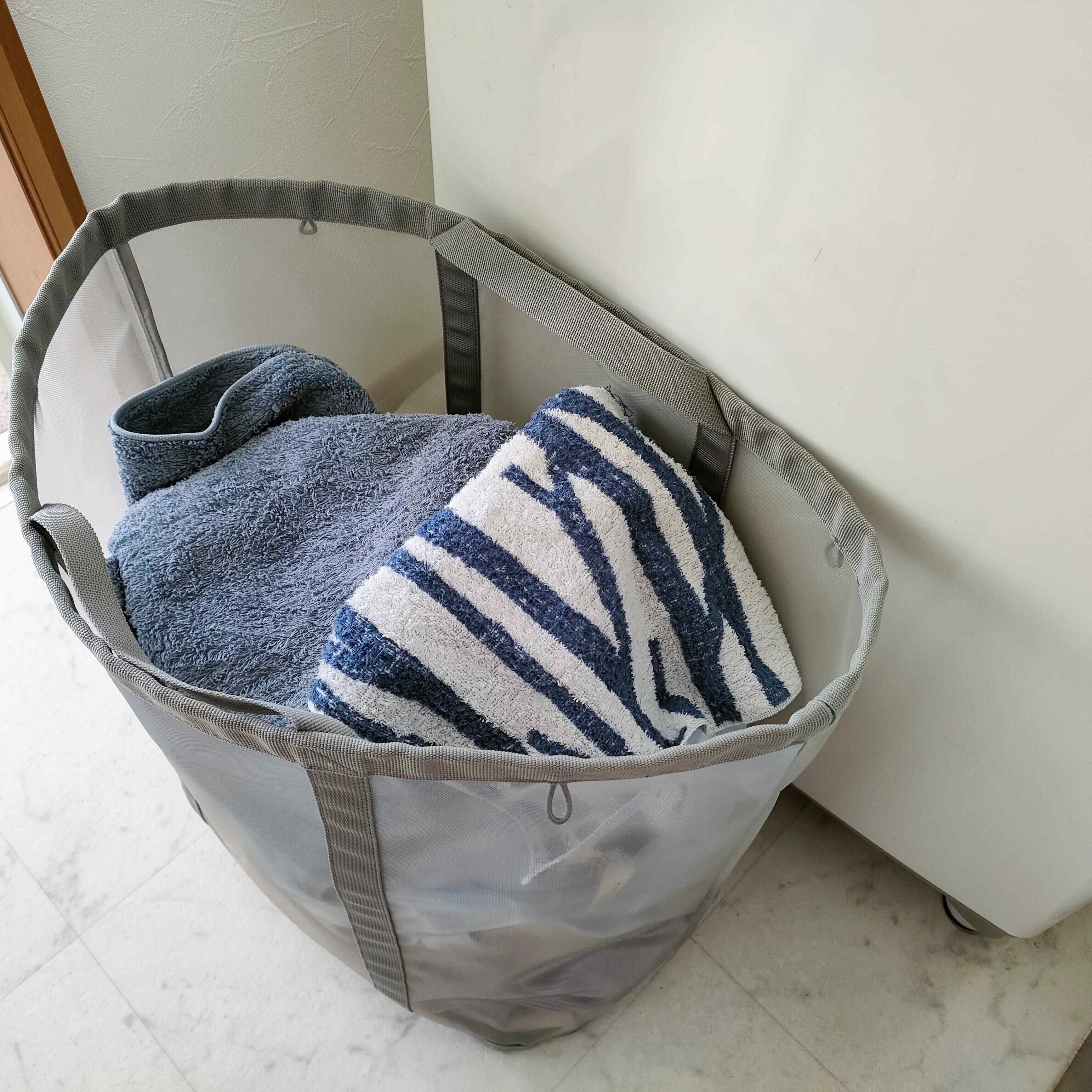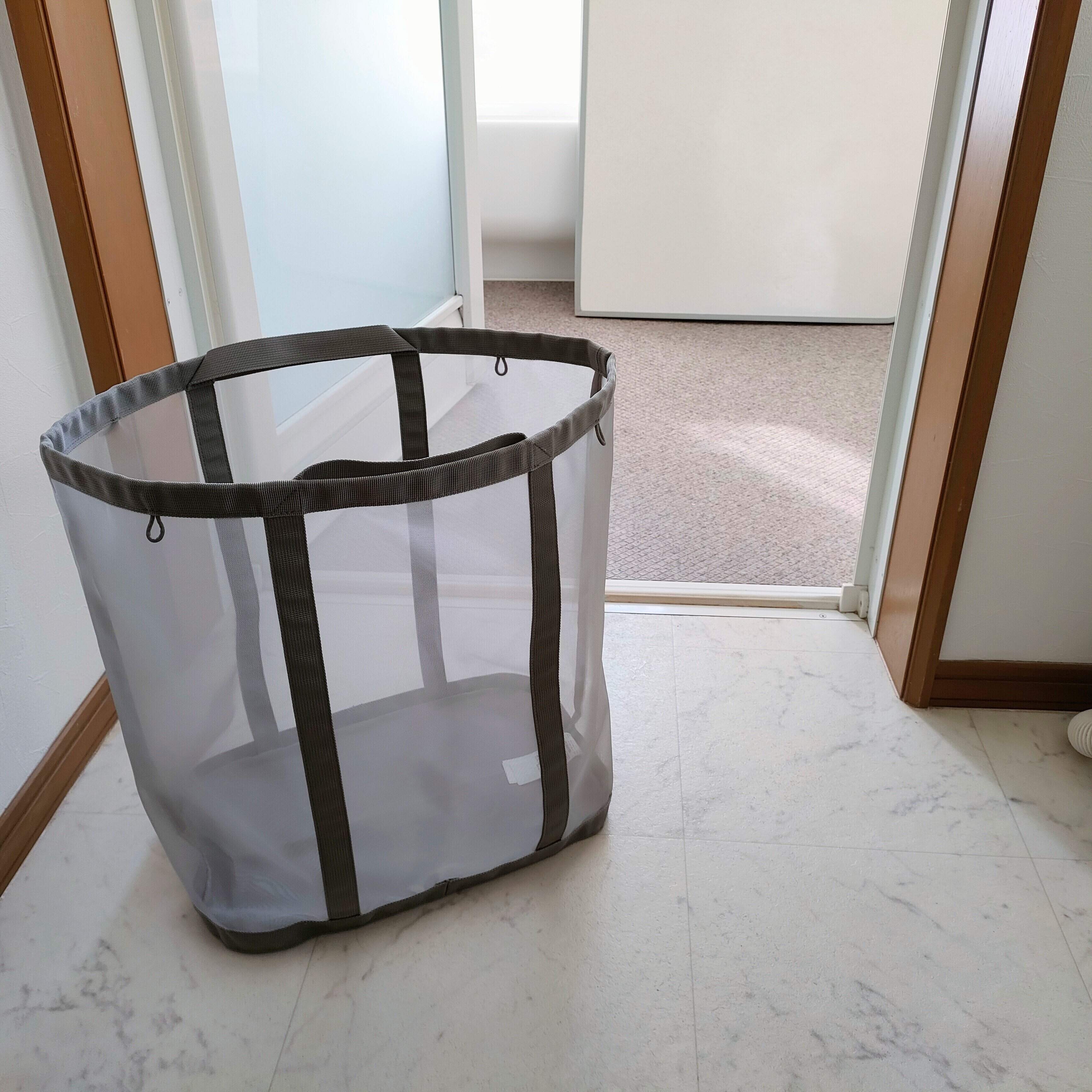 開口部が広いので洗濯物をポイッと入れやすく、たっぷり入る大容量サイズ。我が家は4人家族ですが、1日分の洗濯物を入れられるので助かっています。メッシュの素材上、中身がうっすら透けて見えますが、そこまでごちゃつかず適度にスッキリ見せてくれます。