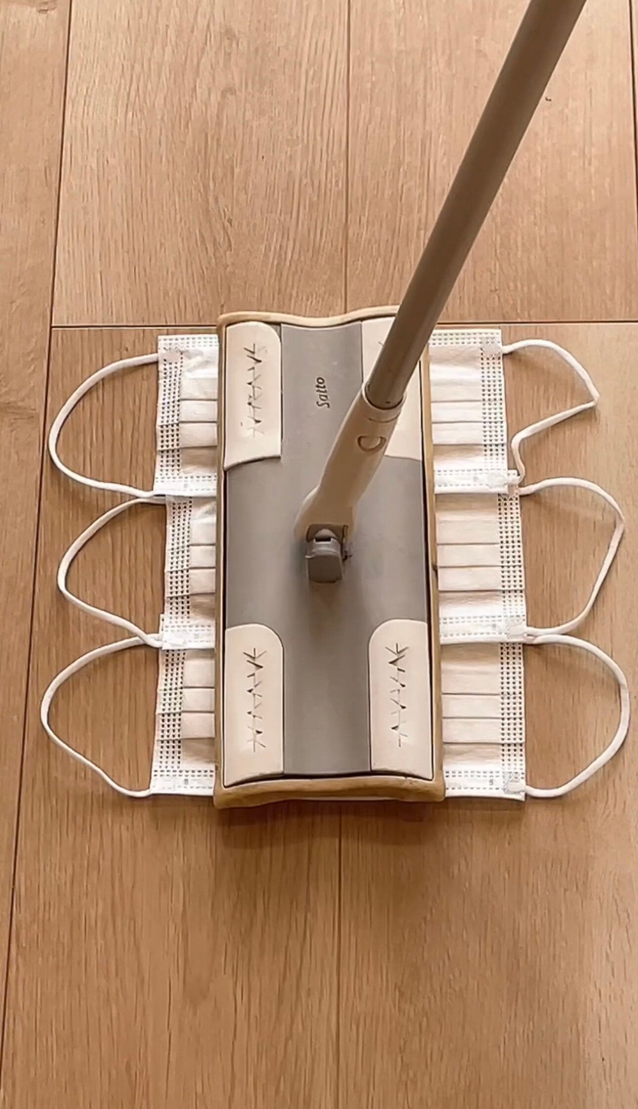 新品余りマスクを3枚並べ、その上にフロアワイパーを乗せます。
