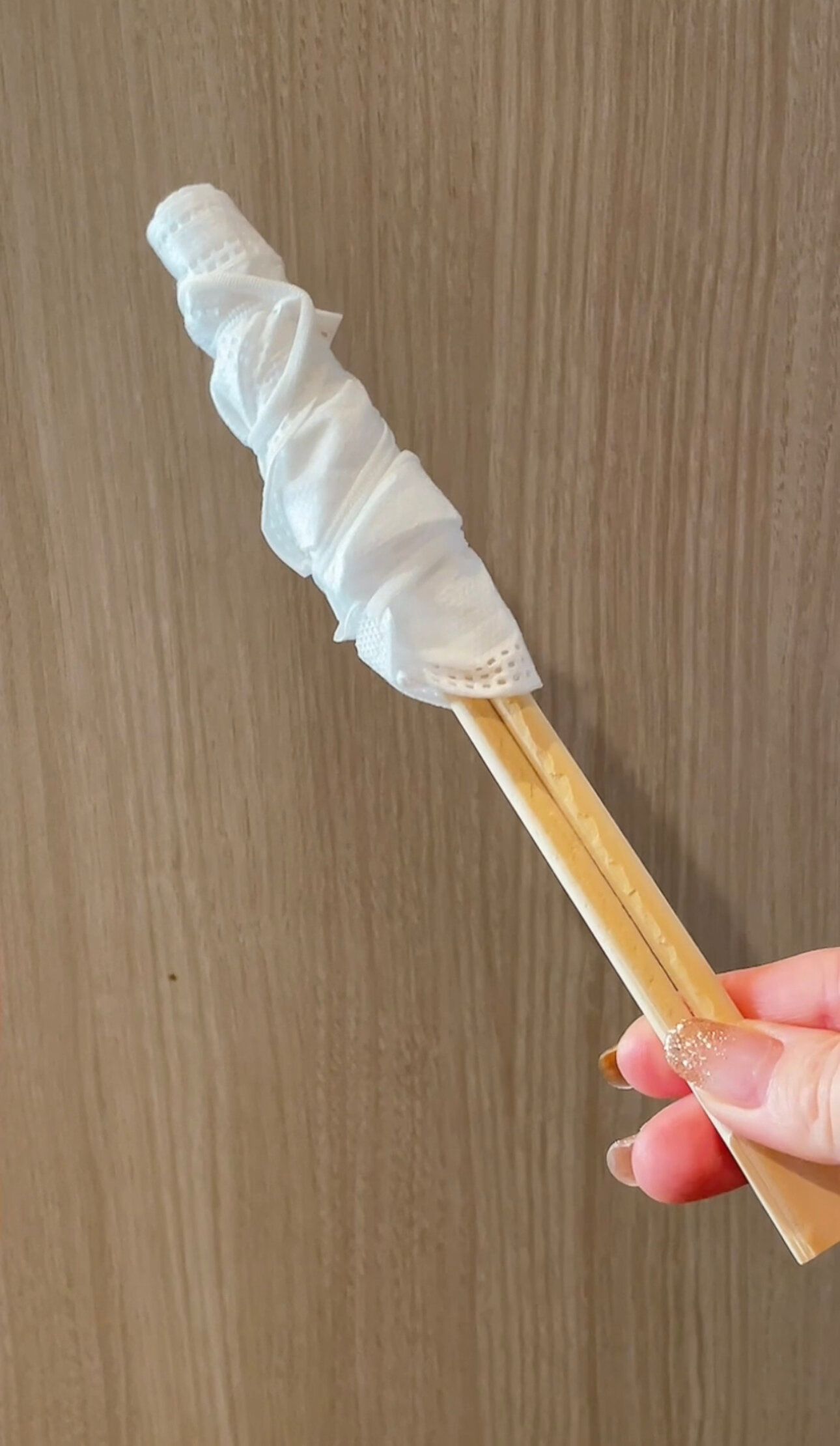 その後、ゴムを割りばしに巻き付けて結べば、お掃除棒の完成!