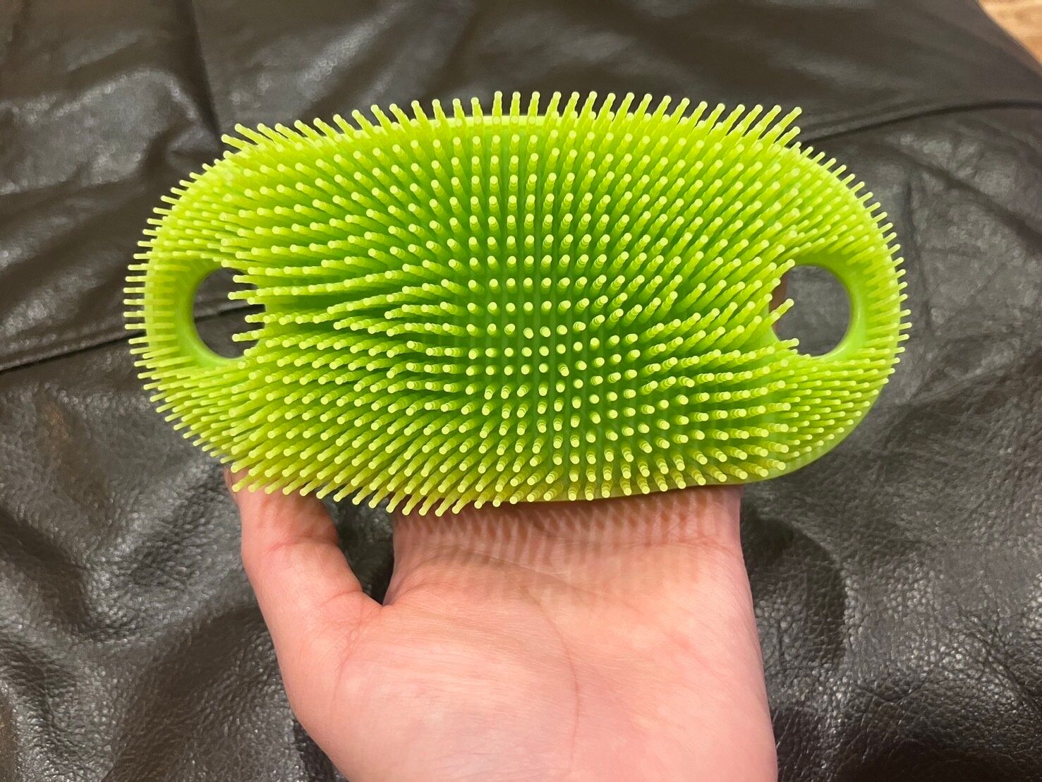 ブラシの穴の部分を片方の足の親指で押さえれば、立ったままもう片方の足を洗うことができます。