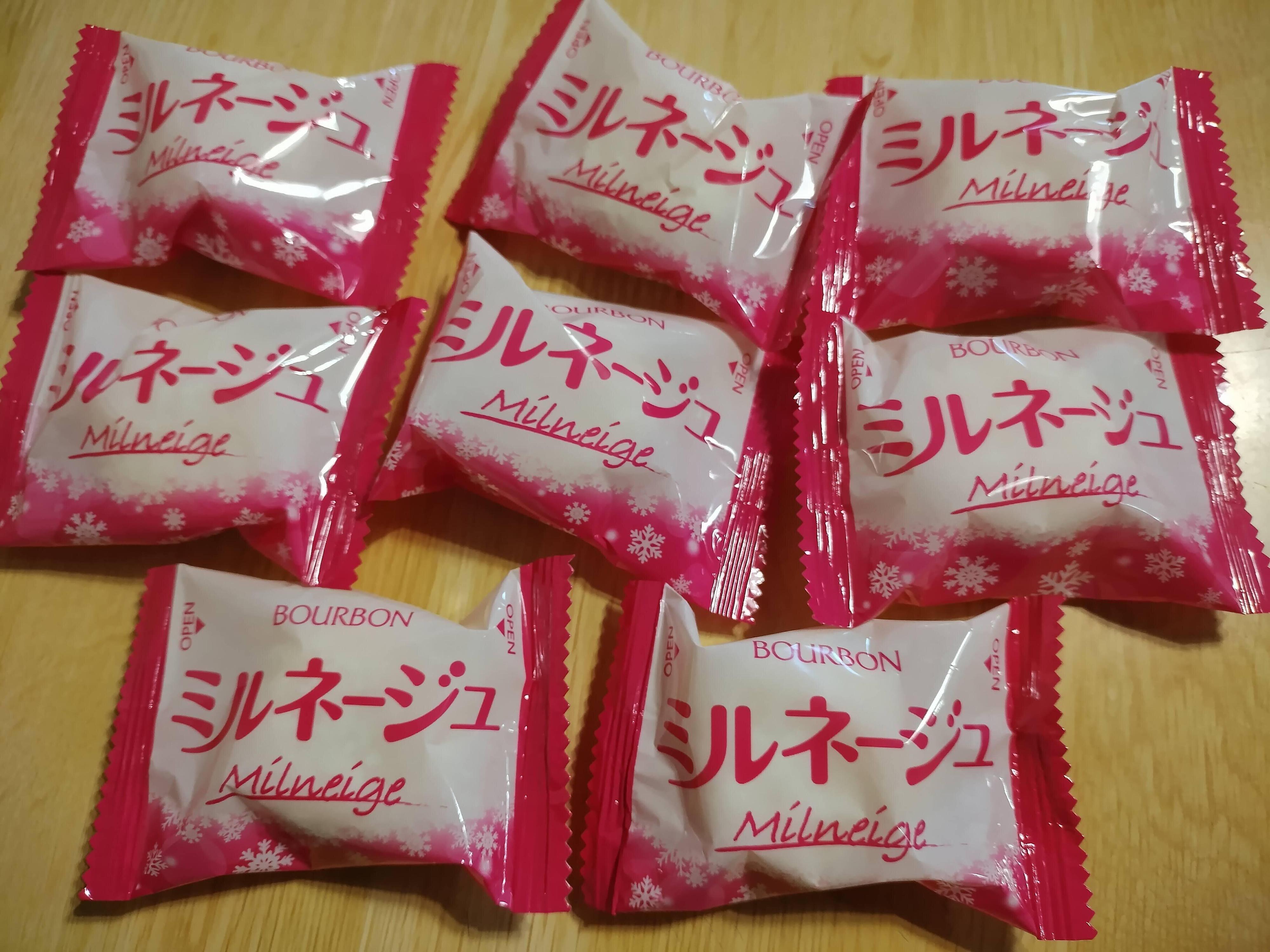 まずはブルボンの「ミルネージュ」から。真っ白な見た目が、冬にぴったりなお菓子です。フランス語で雪を意味する「ネージュ」とミルクを合わせた商品名とのことです。1パックに8個入っていました(個数はパックにより異なる場合があるそうです)。
