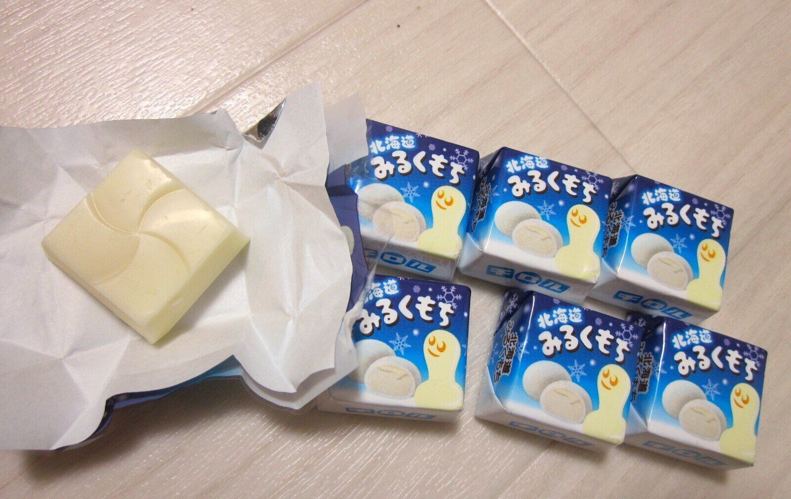 北海道産ミルクを使用しているチロルチョコの「北海道みるくもち」。筆者はドラックストアにて税込108円で購入しました。1袋に7つのチロルチョコが入っています。