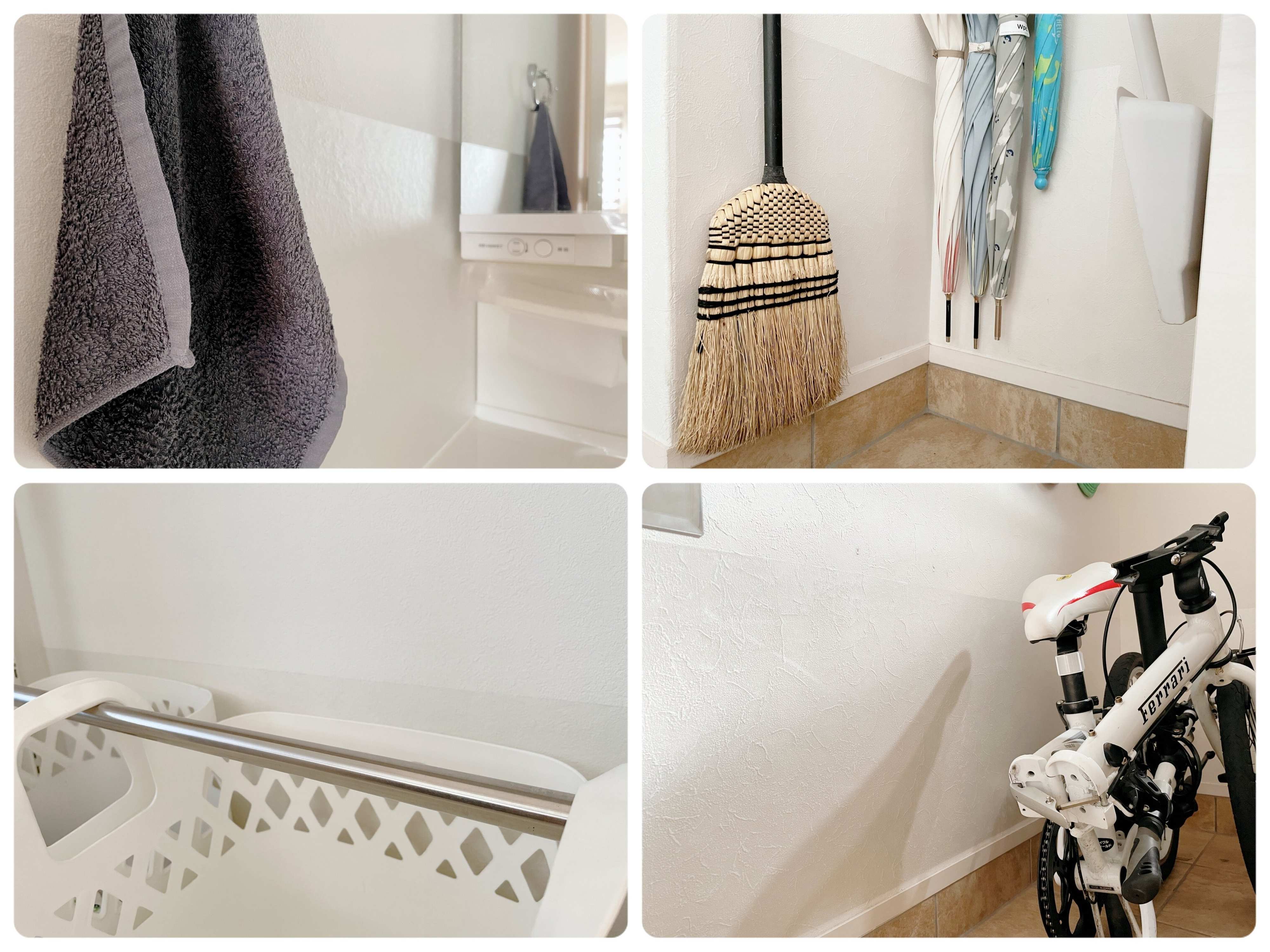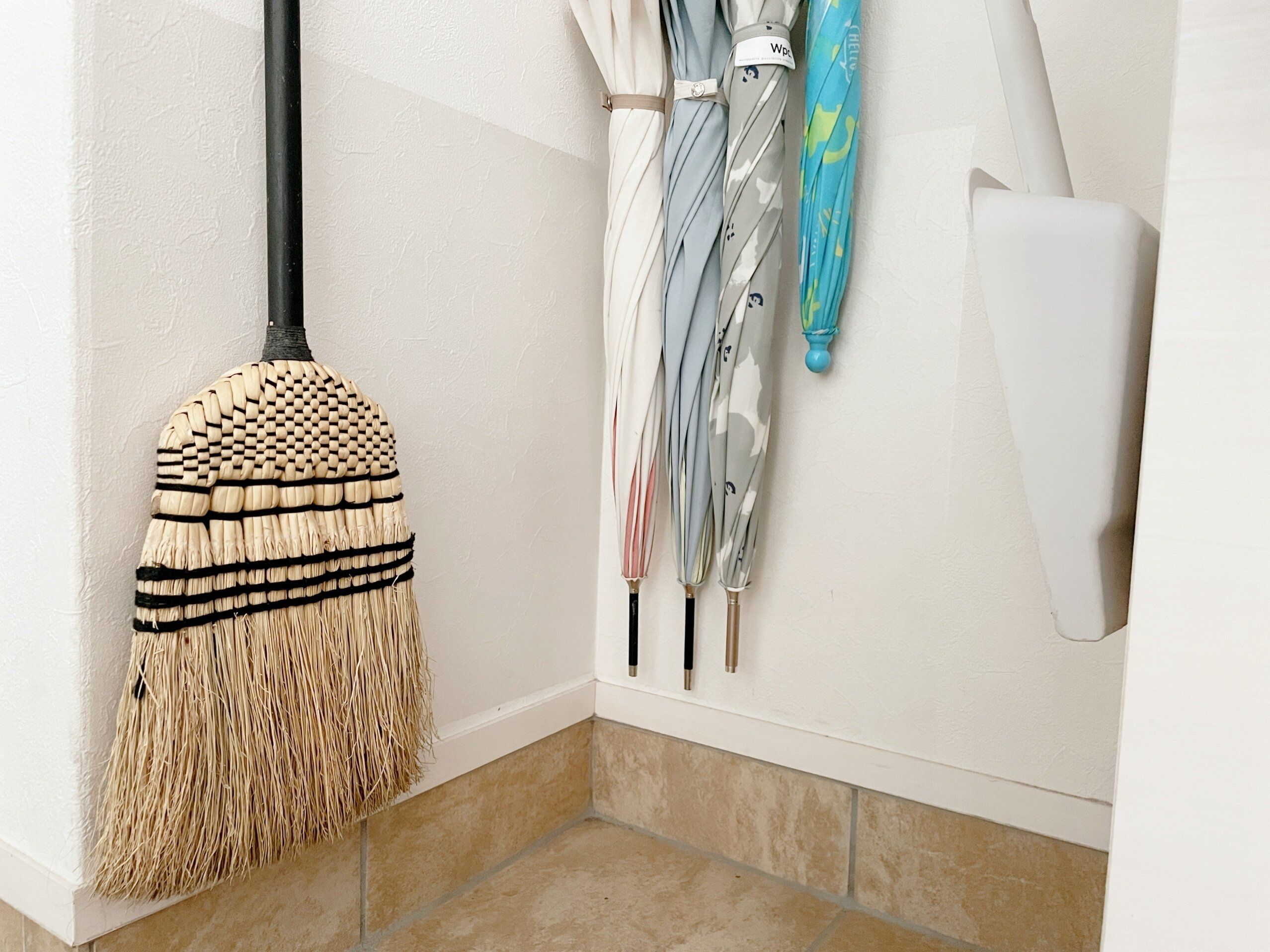 3番目に壁保護シートを設置したのは玄関の右側面。箒と傘を吊るし収納にしたこともあり、接地面の汚れを防ぐために設置しました。