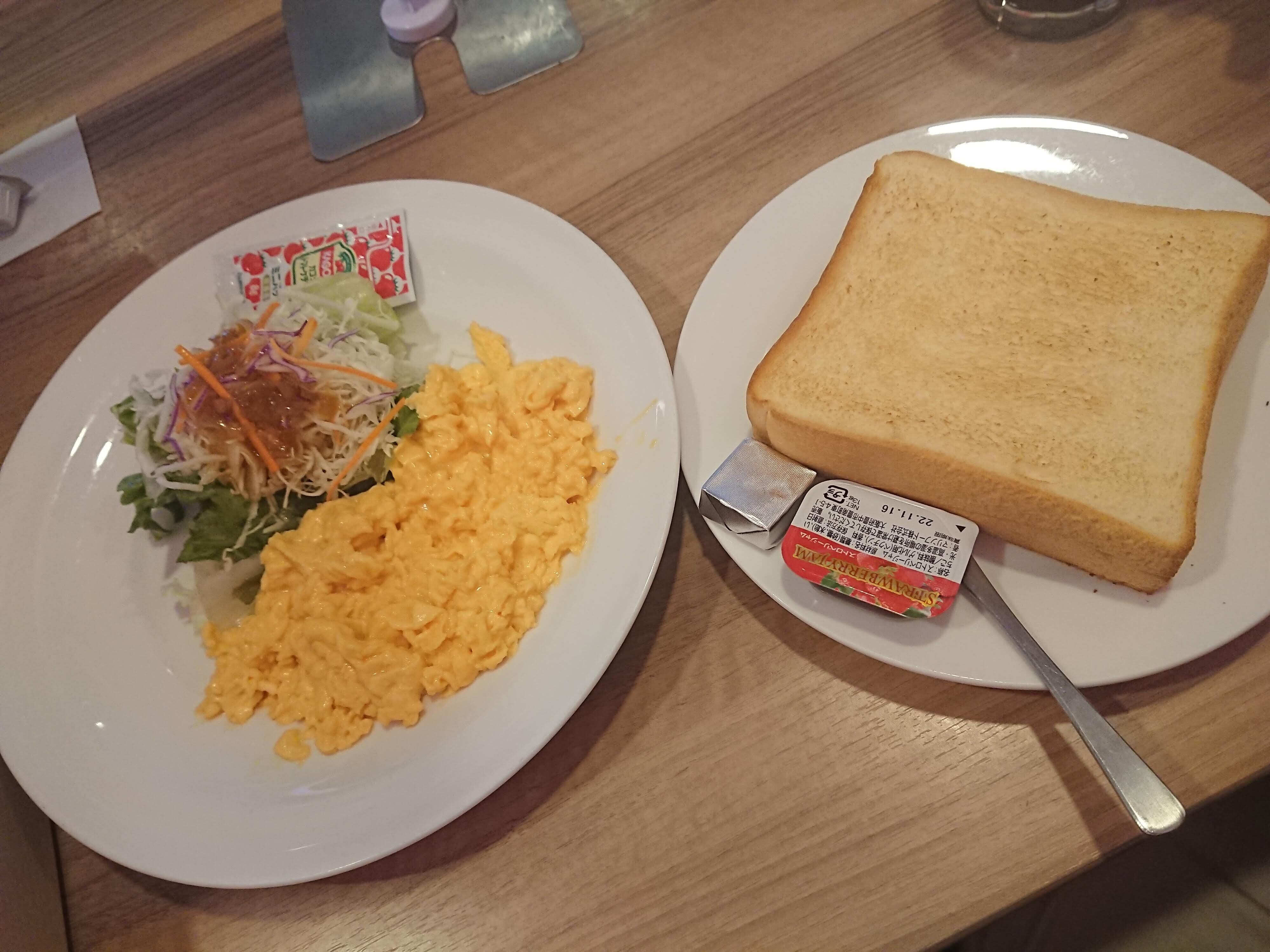 朝はやっぱり玉子料理とパンが良いという方におすすめなのがこちらのスクランブルセット。価格は店舗によって違いますが、税込500〜650円です。スクランブルエッグとサラダがメインのセットです。