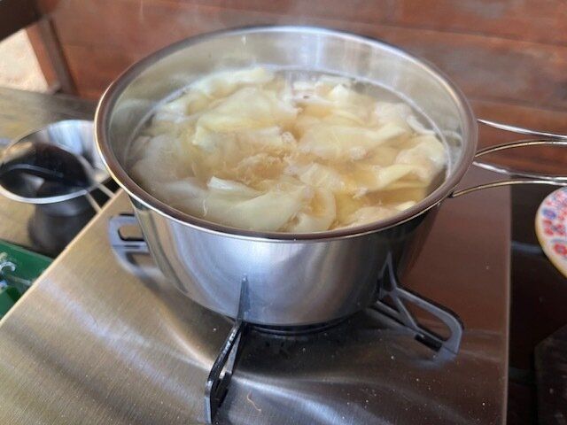 キャンプでの朝ご飯の際にワンタンスープを作ってみました。