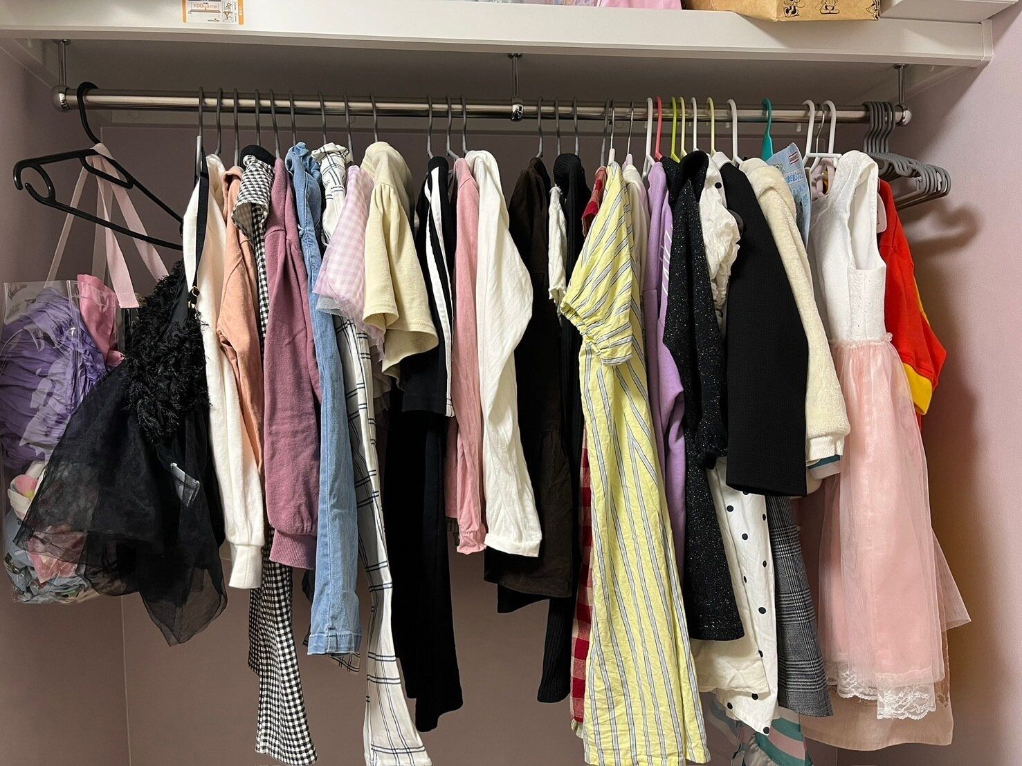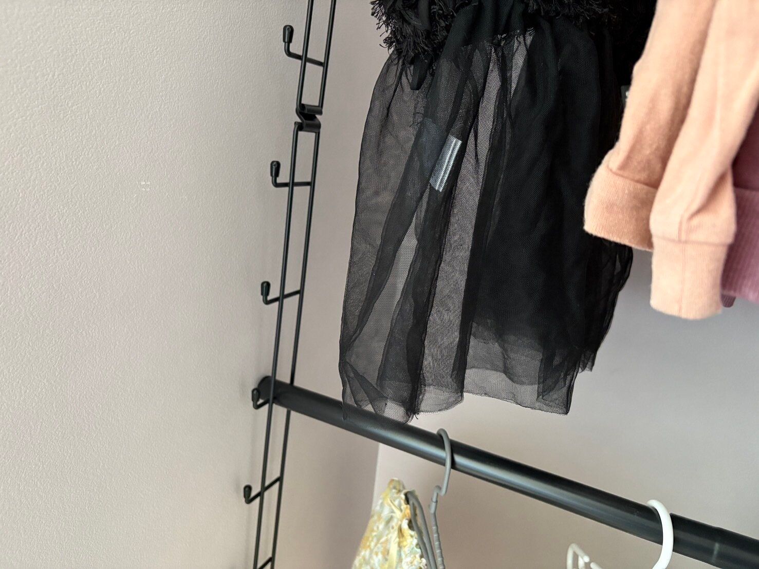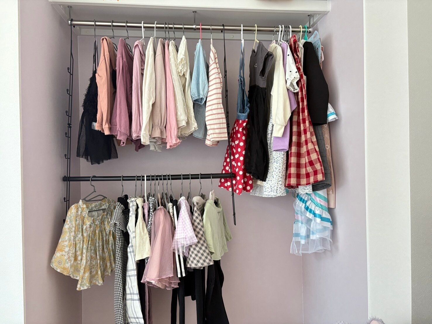 そこで取り入れようと思ったのが、掛ける収納。しかし、子供部屋に備え付けられているハンガーパイプだけでは、あまりたくさん掛けられないのが悩みでした。
