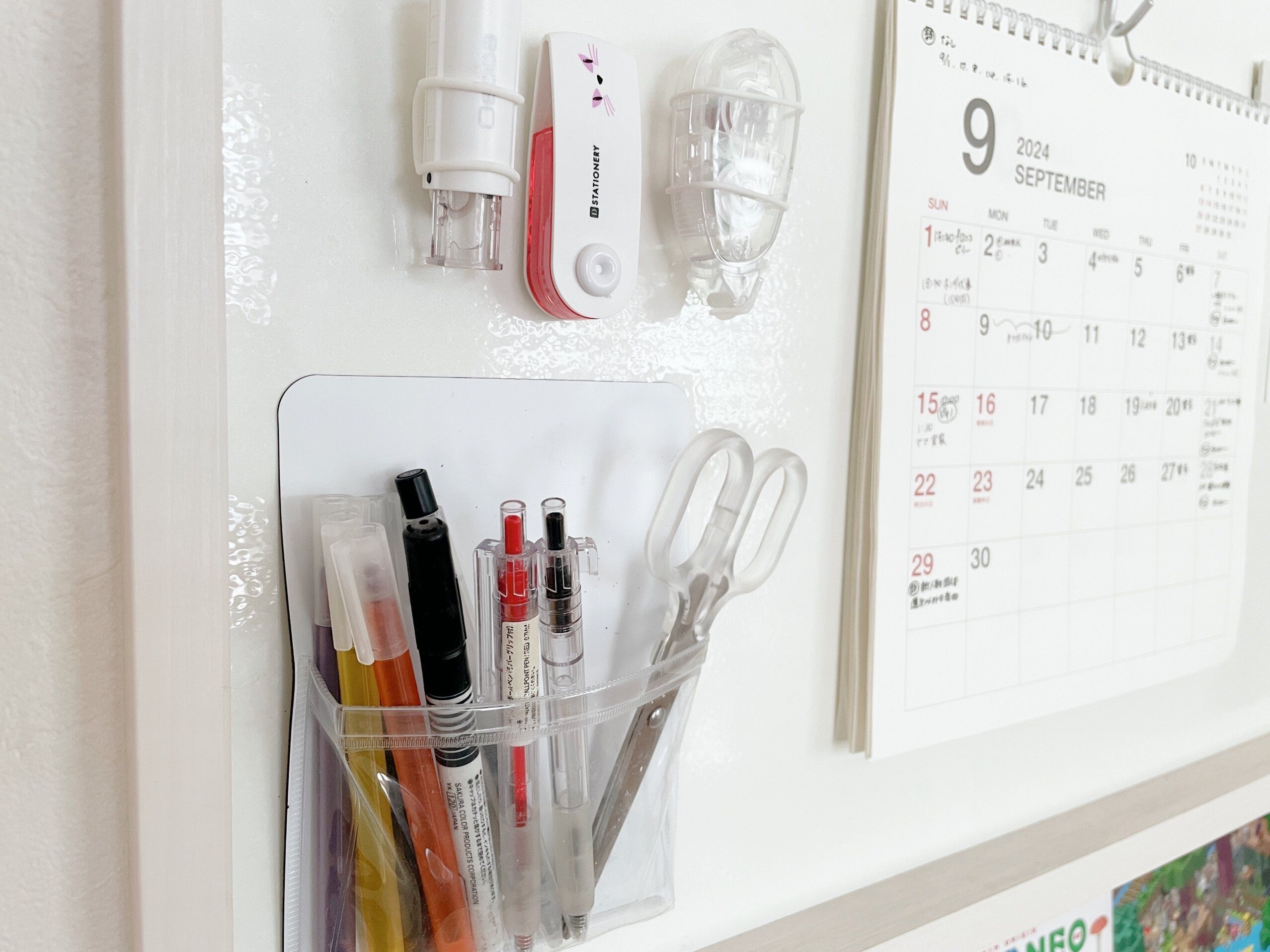 第3の活用法は文房具収納。カレンダーへの書き込みはもちろんですが、ホワイトボードはリビング中央にあるのでここに文房具があるとどこで使うにも便利。セリアの玄関ドアにくっつく「ハンコ」ホルダーを使って印鑑とテープのり、ミニマグネットとマステを使って修正テープを浮かし収納しています。そのほかのハサミやマーカー、ボールペンや名前ペンはキャンドゥのマグネットポケットに入れて収納しています。