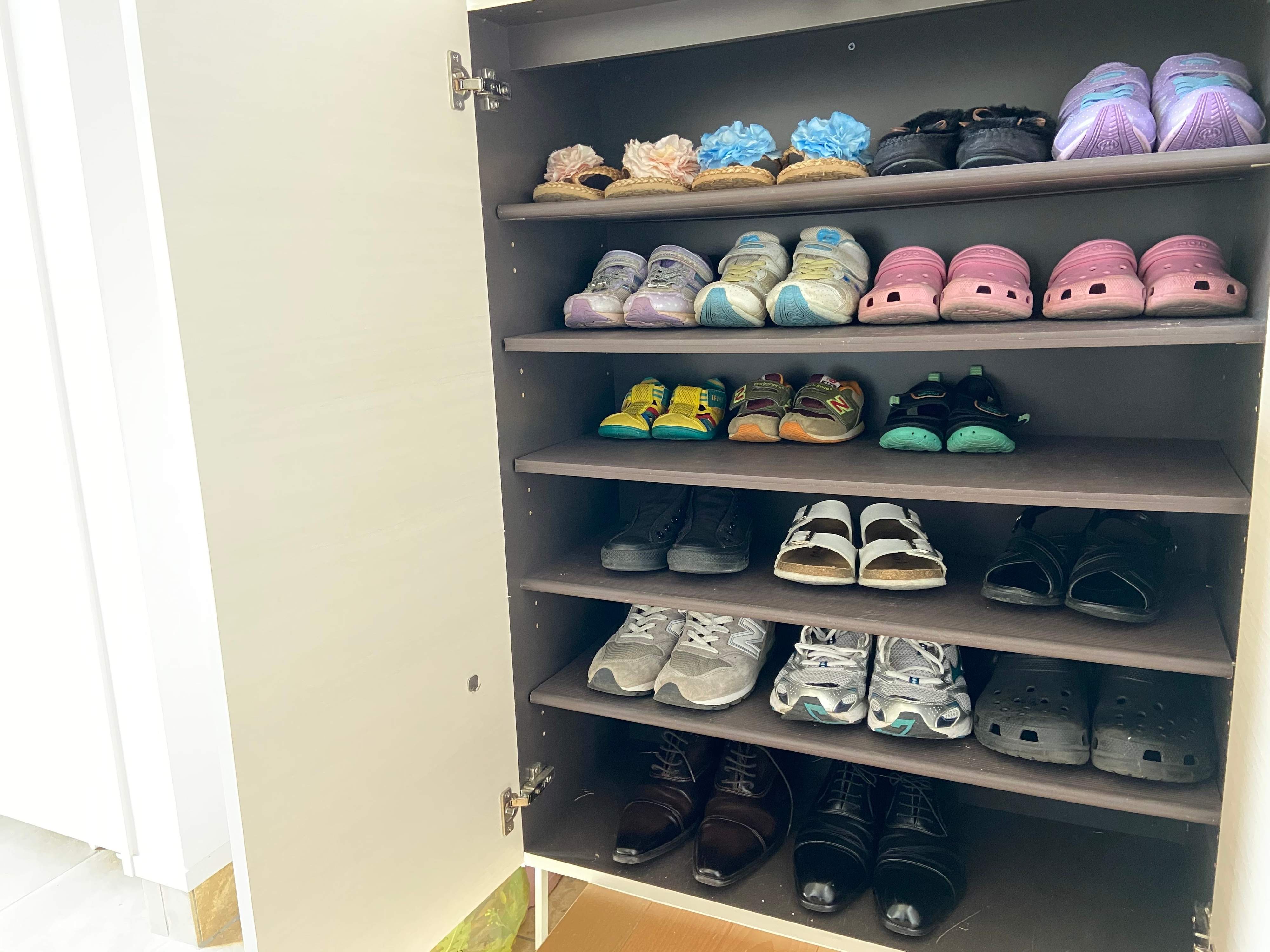 まず第1にどれだけどんな靴を持っているのか把握しやすく、収納量が少なくすむということです!我が家の場合、靴の持ち数が少ないので、靴箱は1/4が日常的に使う靴を収納する場所、1/4が慶弔用の靴と保管用の靴を収納する場所で、残りの2/4は防災グッズと子どもの学用品の収納場所に使っています。