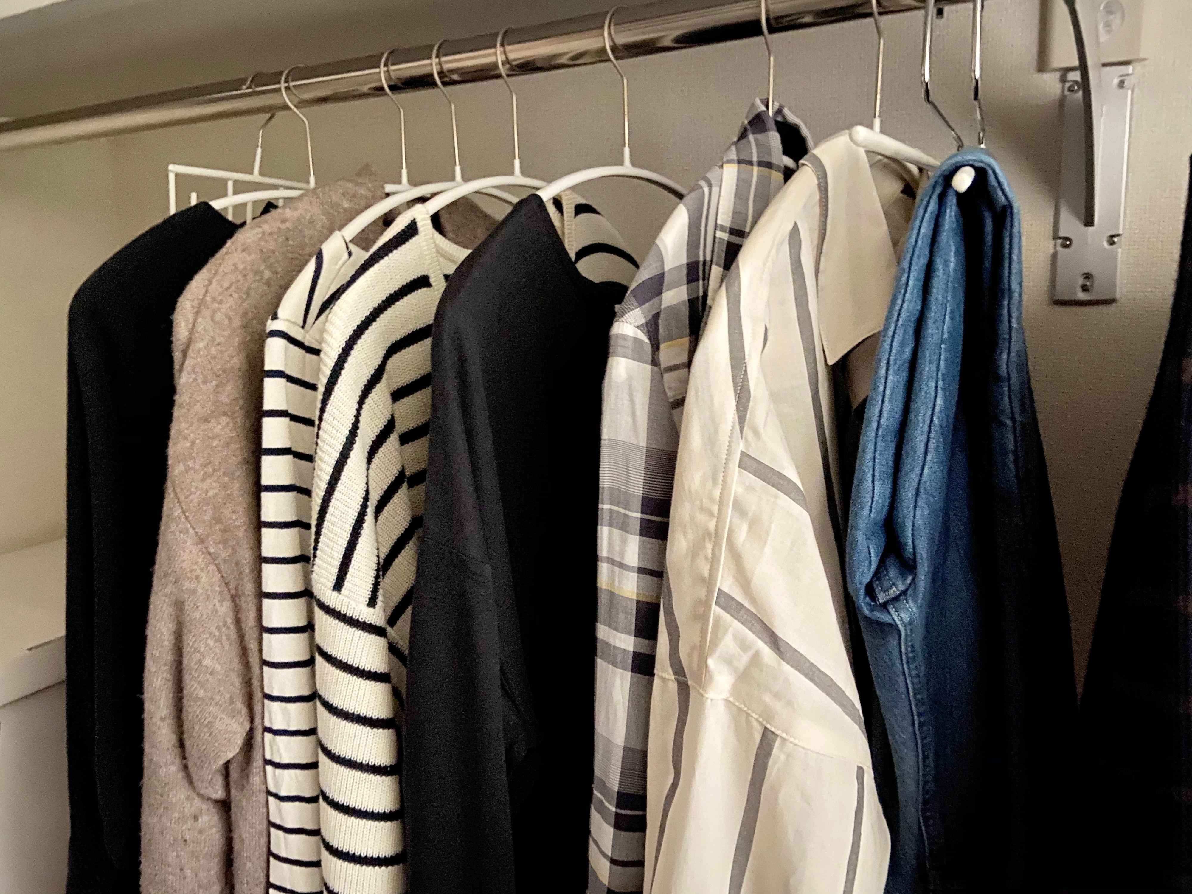 衣替えがとても簡単で、収納に場所を取りません。日常的に着る服は全てハンガー収納にすることで、洗濯物を畳む時間も省けます。靴のメリットと同様に、新しく買い足すのが計画的に決められ、無駄遣いをしません。