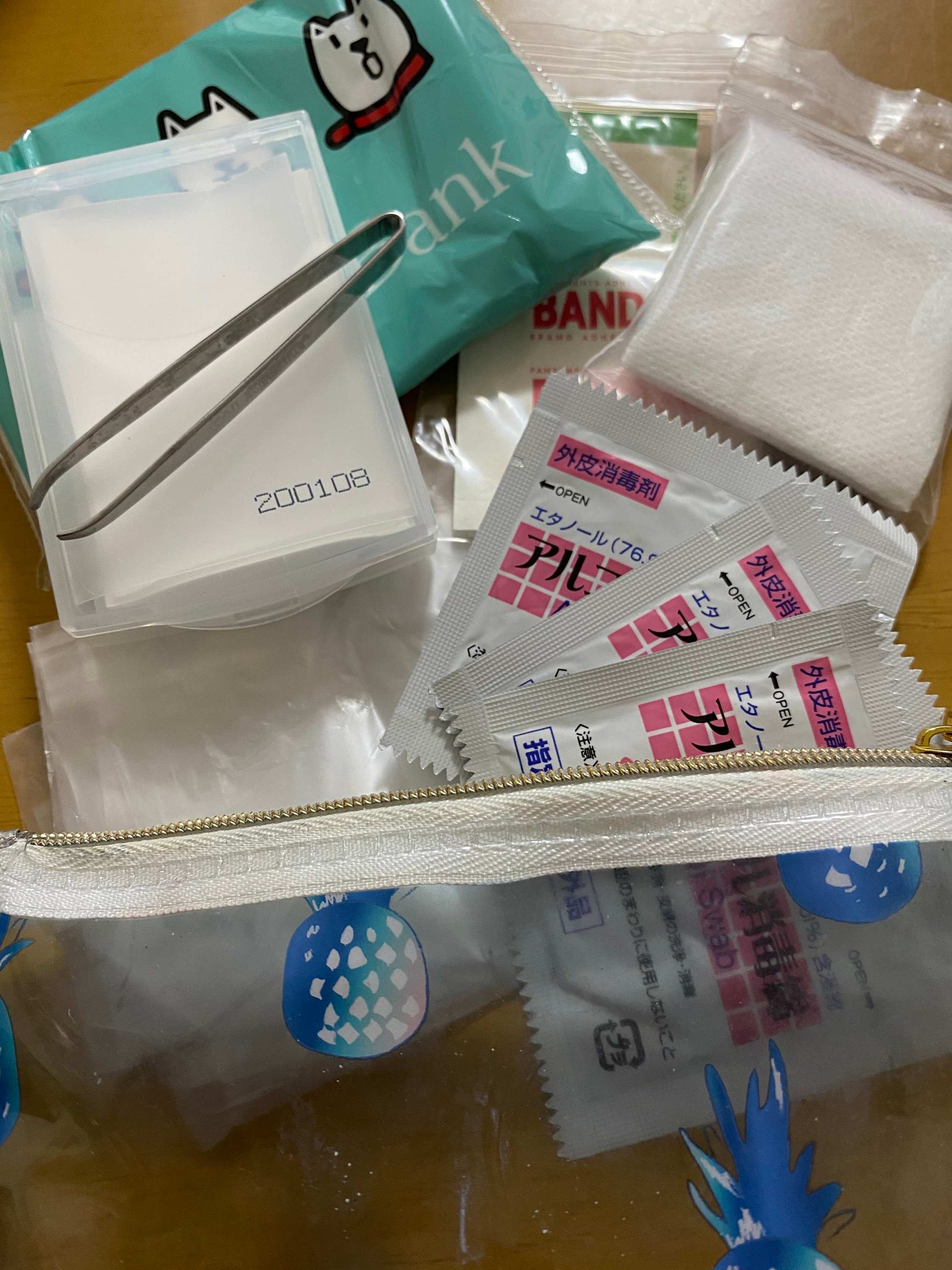 絆創膏、コットン、アルコール消毒綿、毛抜き、ビニール袋、フィルム石鹸、ティッシュ。