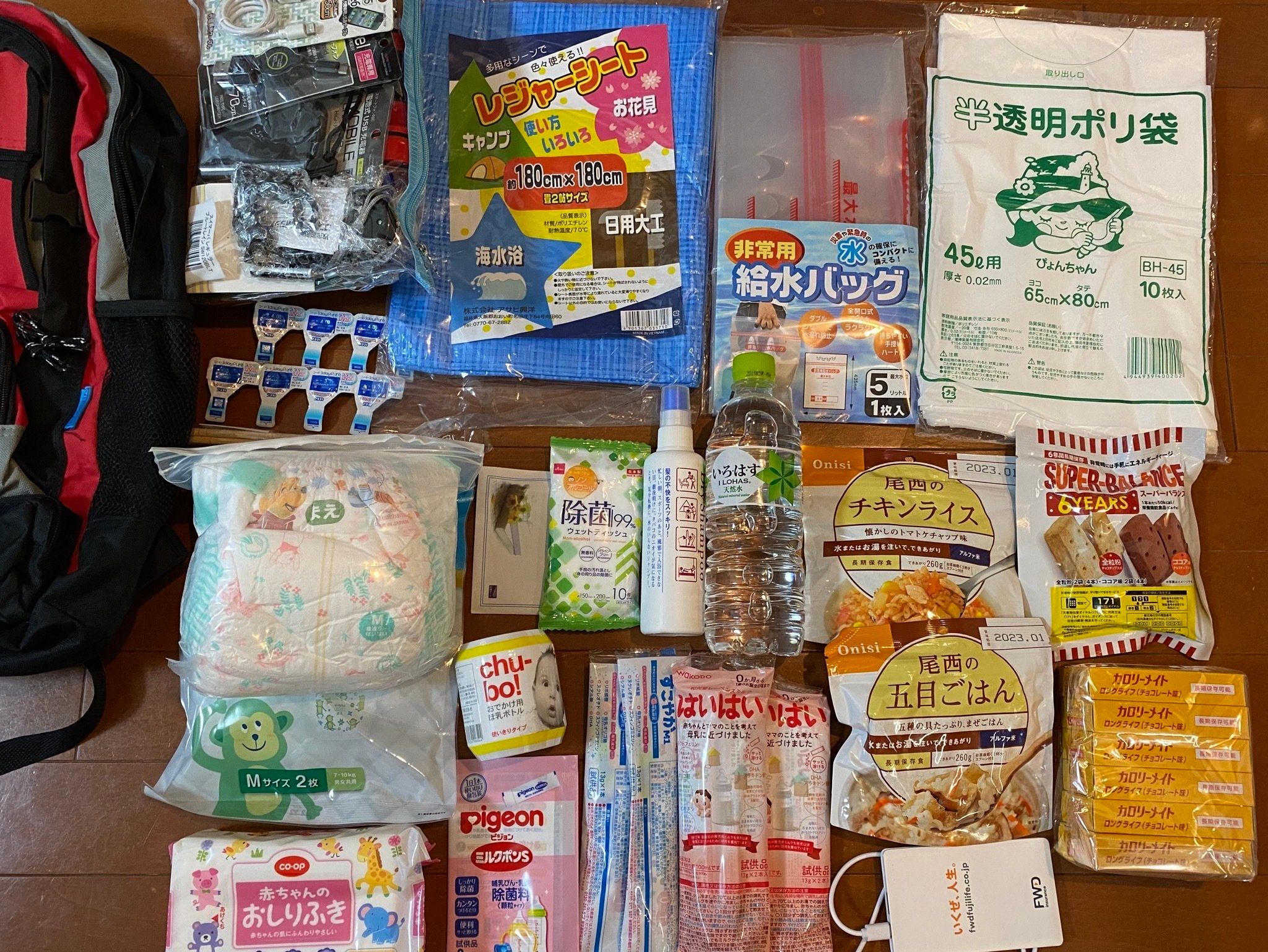 充電器、コンタクト、レジャーシート、給水バック、ポリ袋、お尻拭き、オムツ、携帯用哺乳瓶、粉ミルク試供品、除菌ティッシュテレホンカード、水のいらないシャンプー、水、食糧、