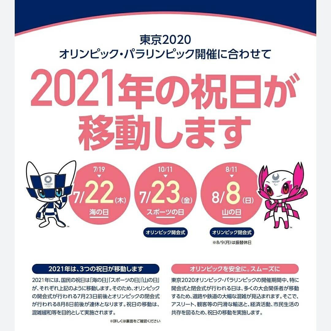 7月19日(月)の海の日が7月22日(木)、10月11日(月)のスポーツの日が7月23日(金)、8月11日(水)の山の日が8月8日(日)に移動されます。