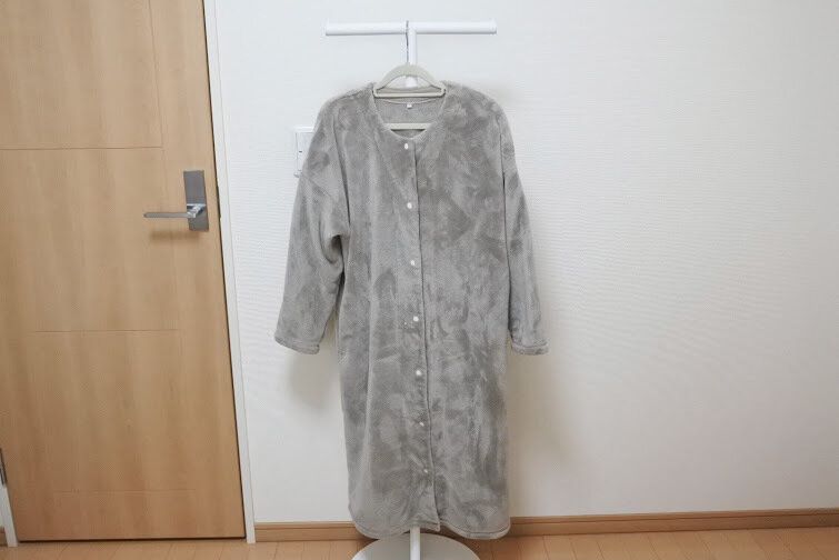 毛布に包まれているようなあたたかさです。フードもなく襟ぐりがスッキリしていてスナップボタンで前をとめることができるので、このまま布団に入るこもできて便利です。