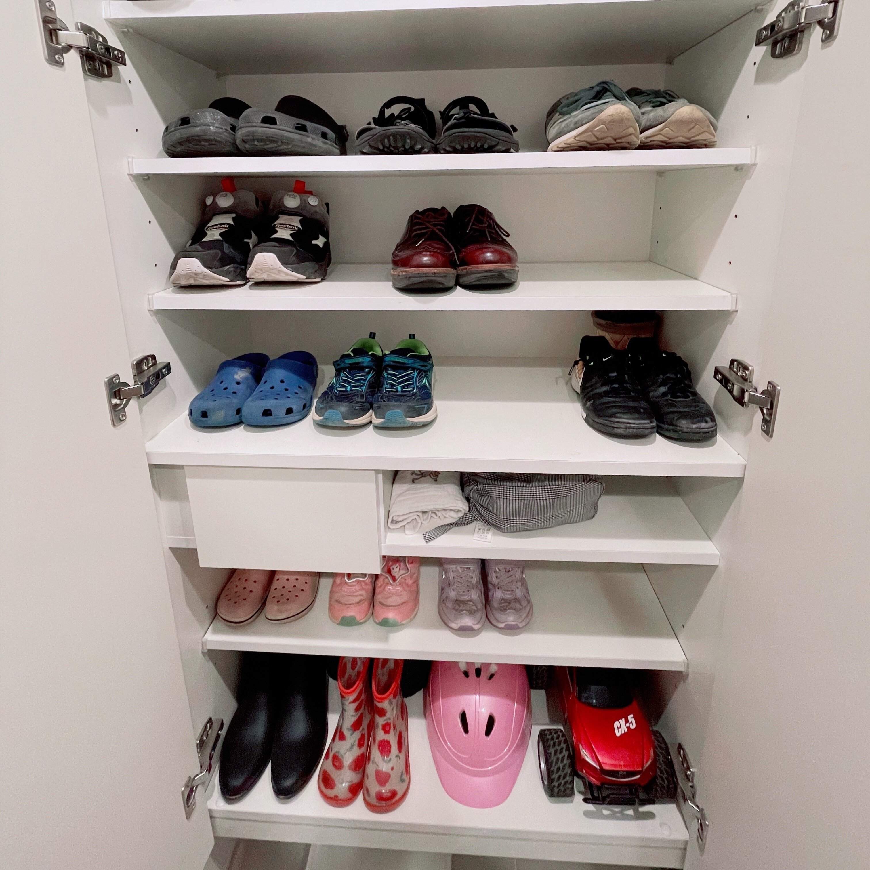 わが家の玄関収納は、天井まであるので家族分の靴をしまうには充分なスペースがあります。