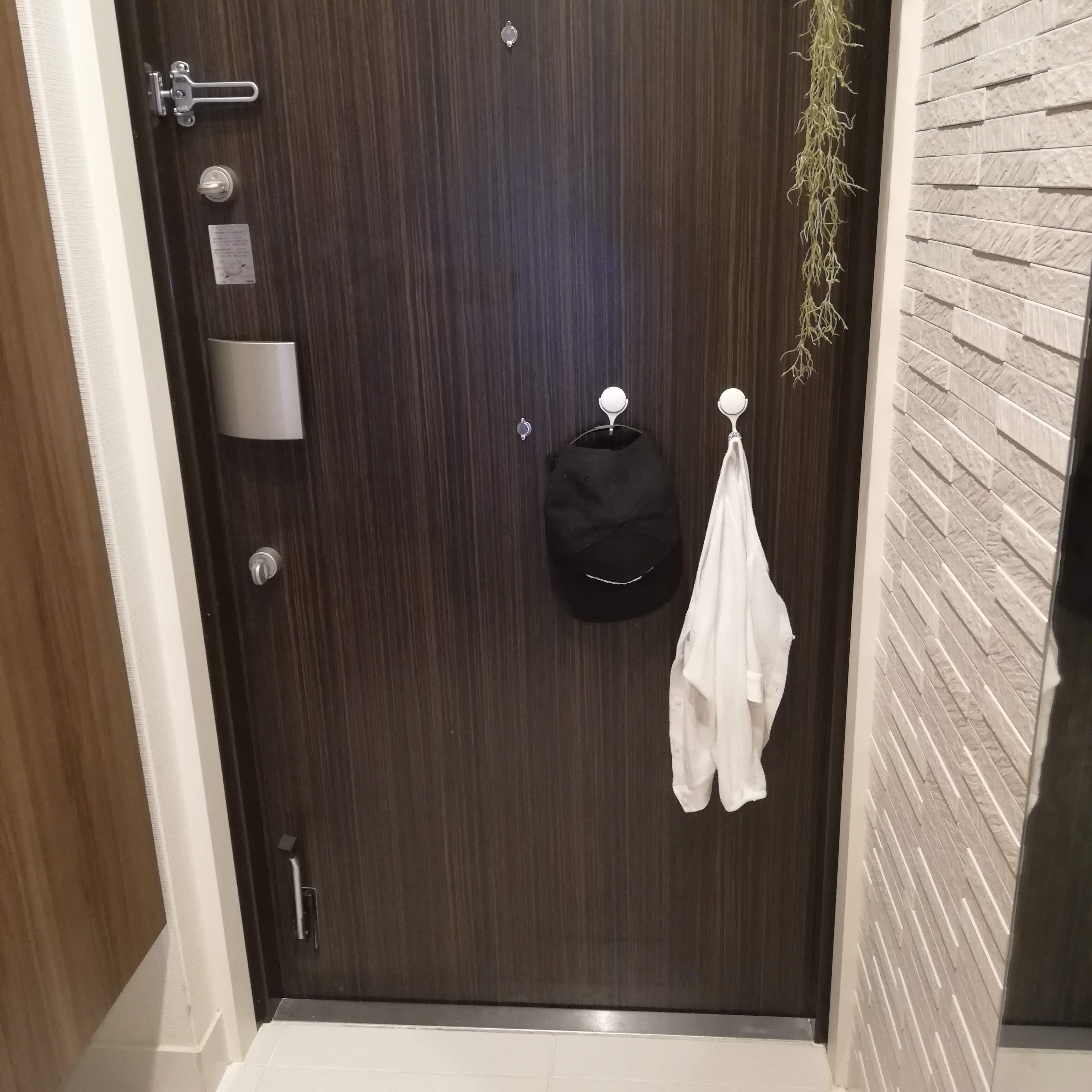 マグネットが付く玄関の扉なので、マグネットフックを付けて、子供たちの帽子や上着を掛けています。