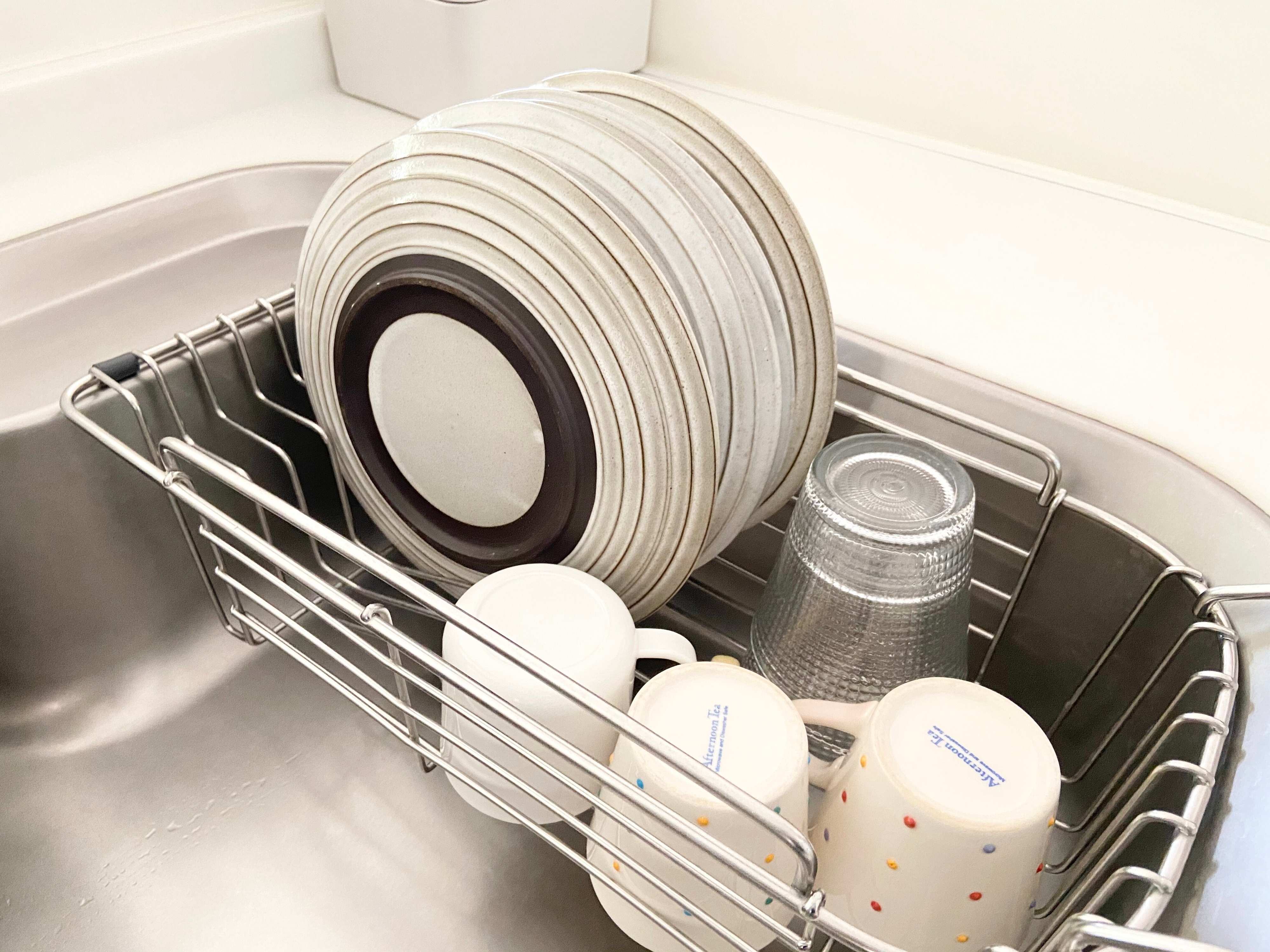 水切りカゴを使った場合、食器も全て立てておくことができ、水はシンクに流れていくので、乾くのが非常に早いです。