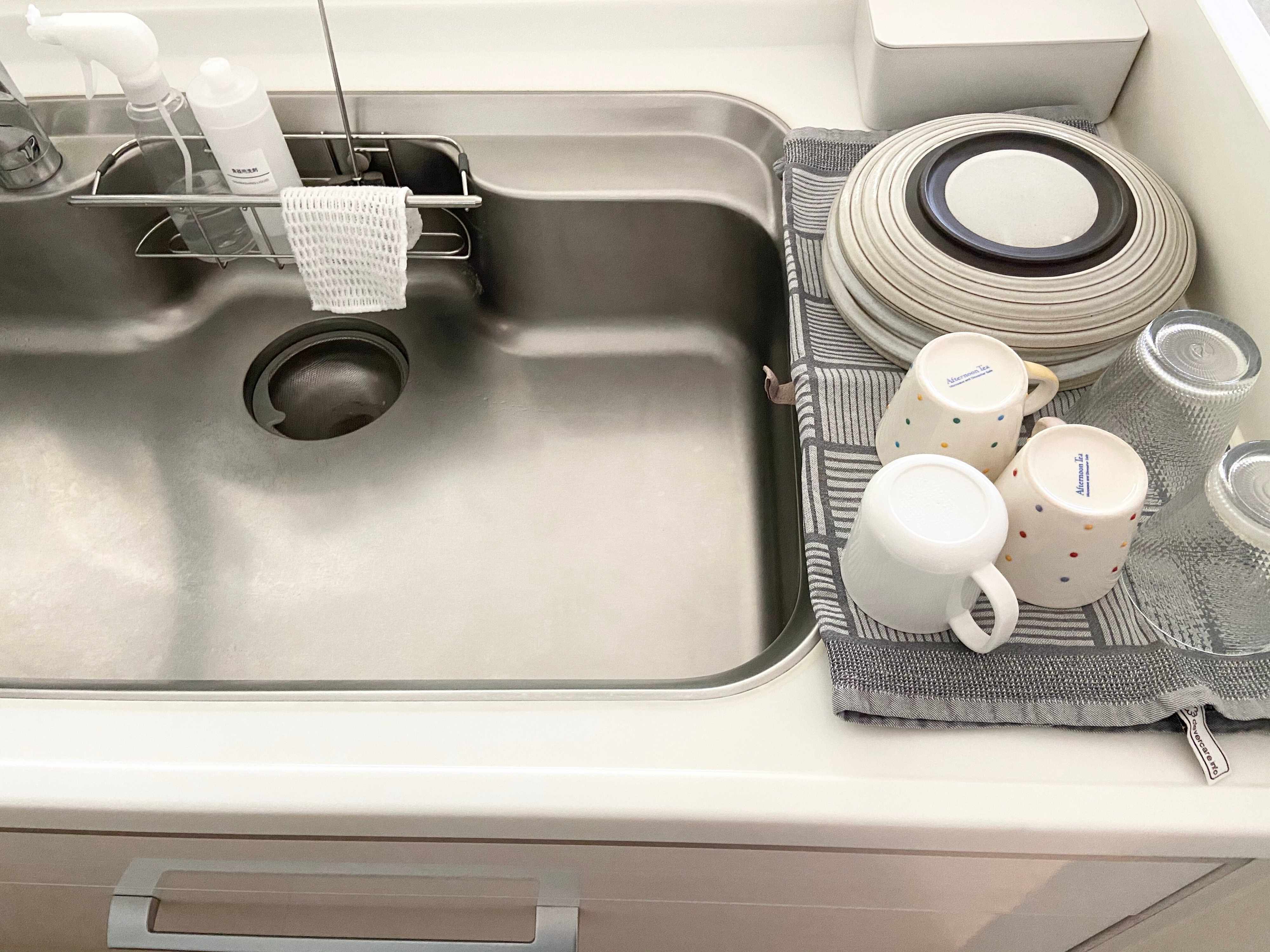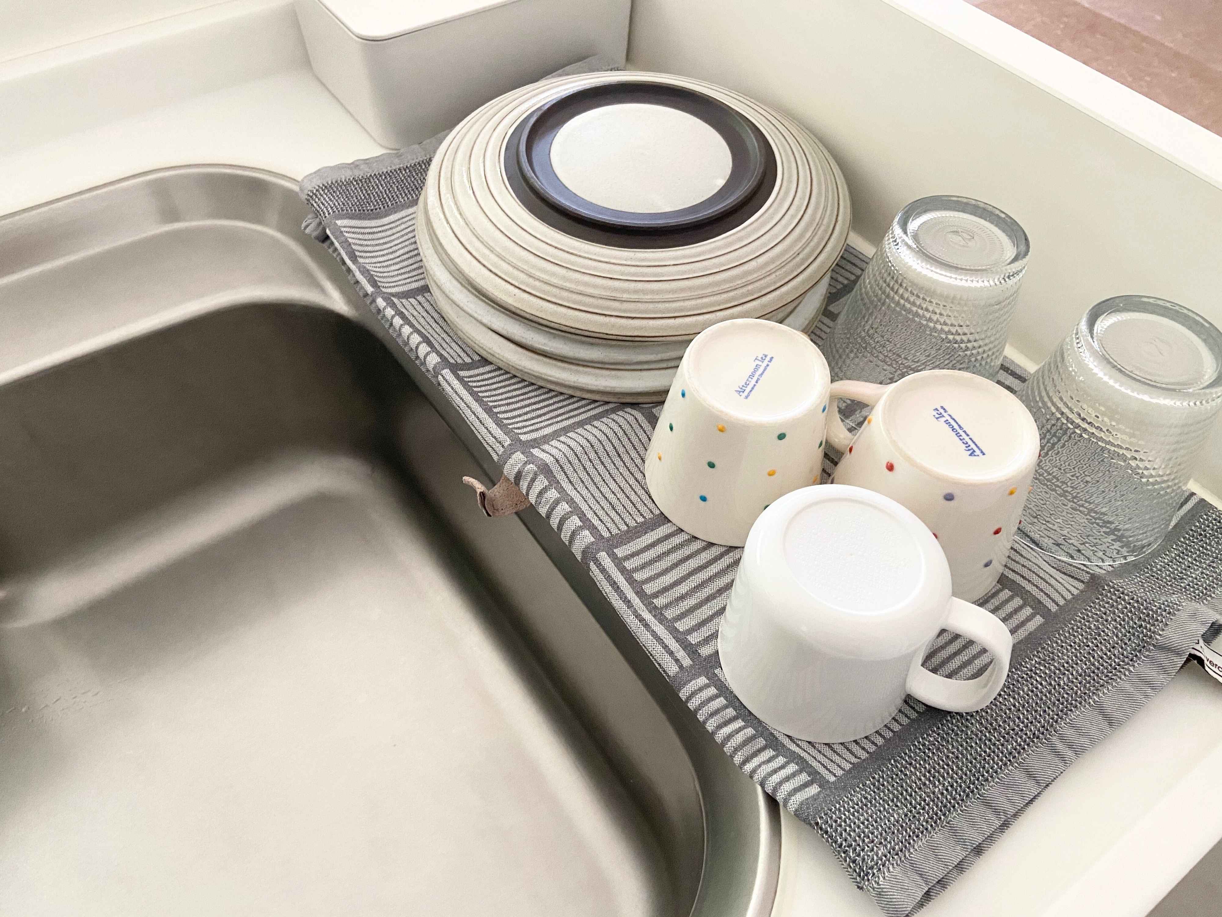 水切りカゴなら週末に食洗機に入れて洗っておしまいですが、ティータオルだと毎日洗う必要がありますよね。洗い物が多いとティータオルが2枚になったりも。布類の洗い物は1枚でも減らしたいのが正直なところなので、これは大きなデメリットでした。
