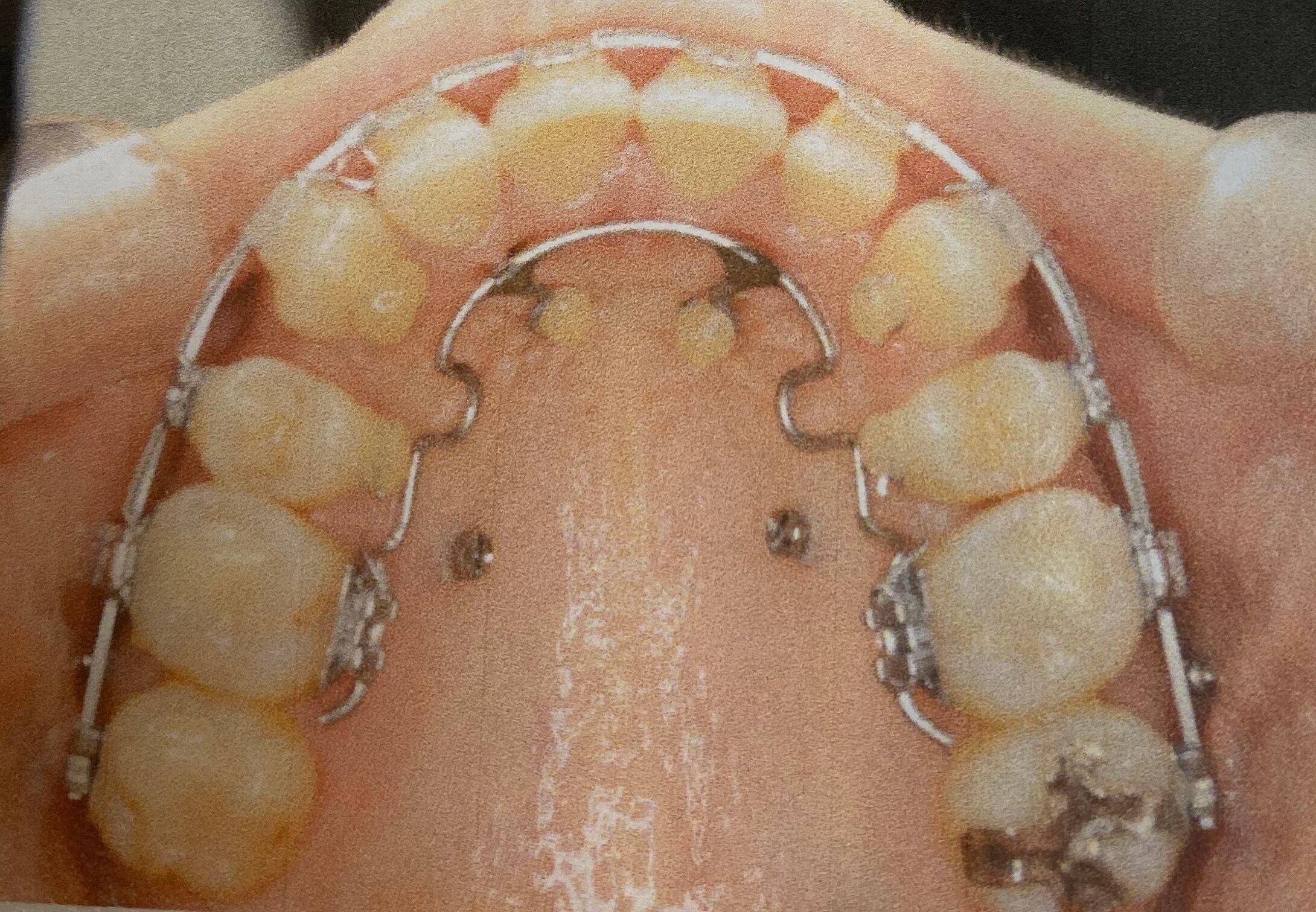 その後、スクリュー(ねじ)を歯茎に埋め、そこと矯正器具をゴムでつなぐという処置も行いました。