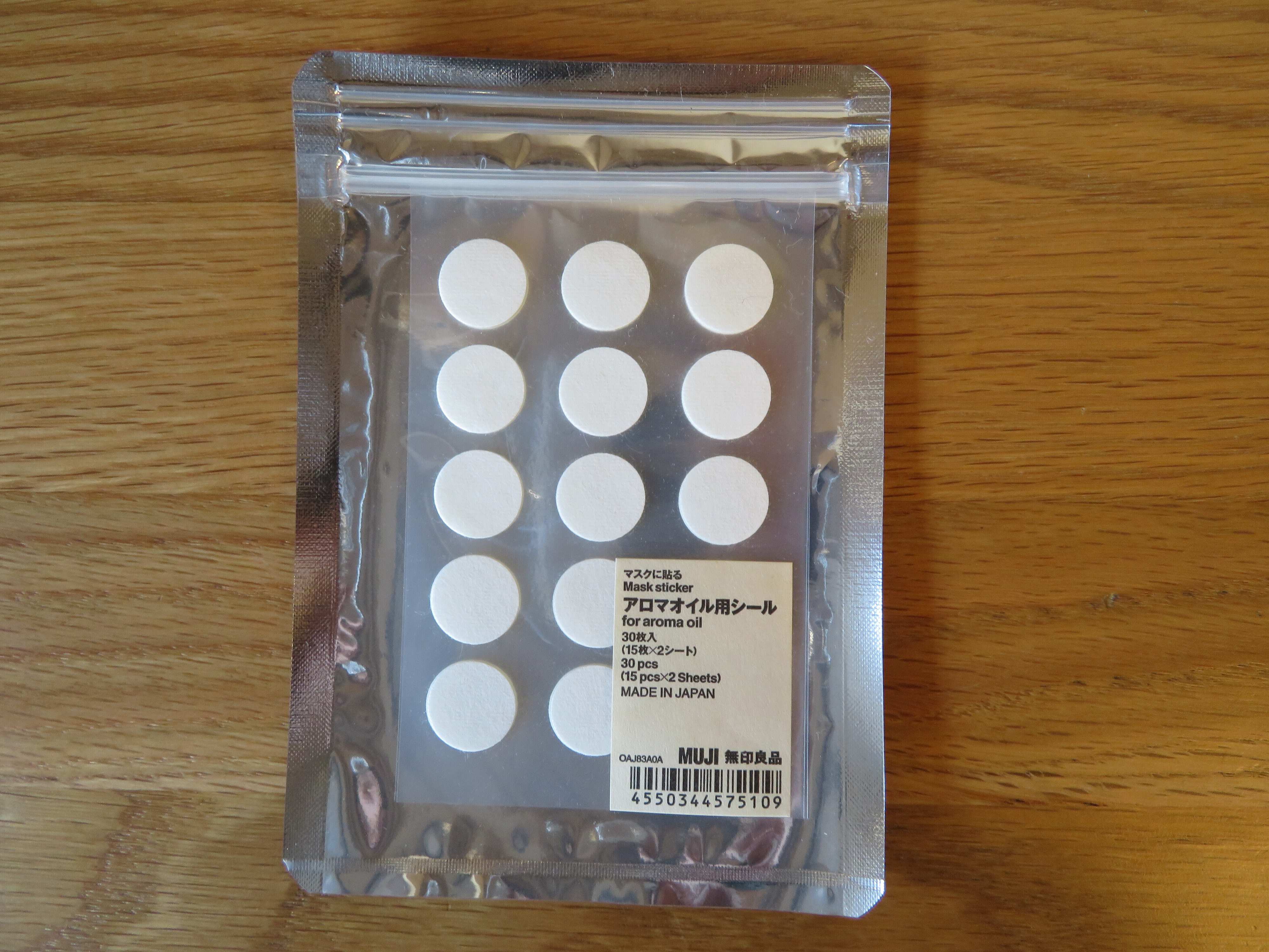 そこで使うことになったのが、無印良品の「マスクに貼るアロマオイルシール」(税込390円)です。