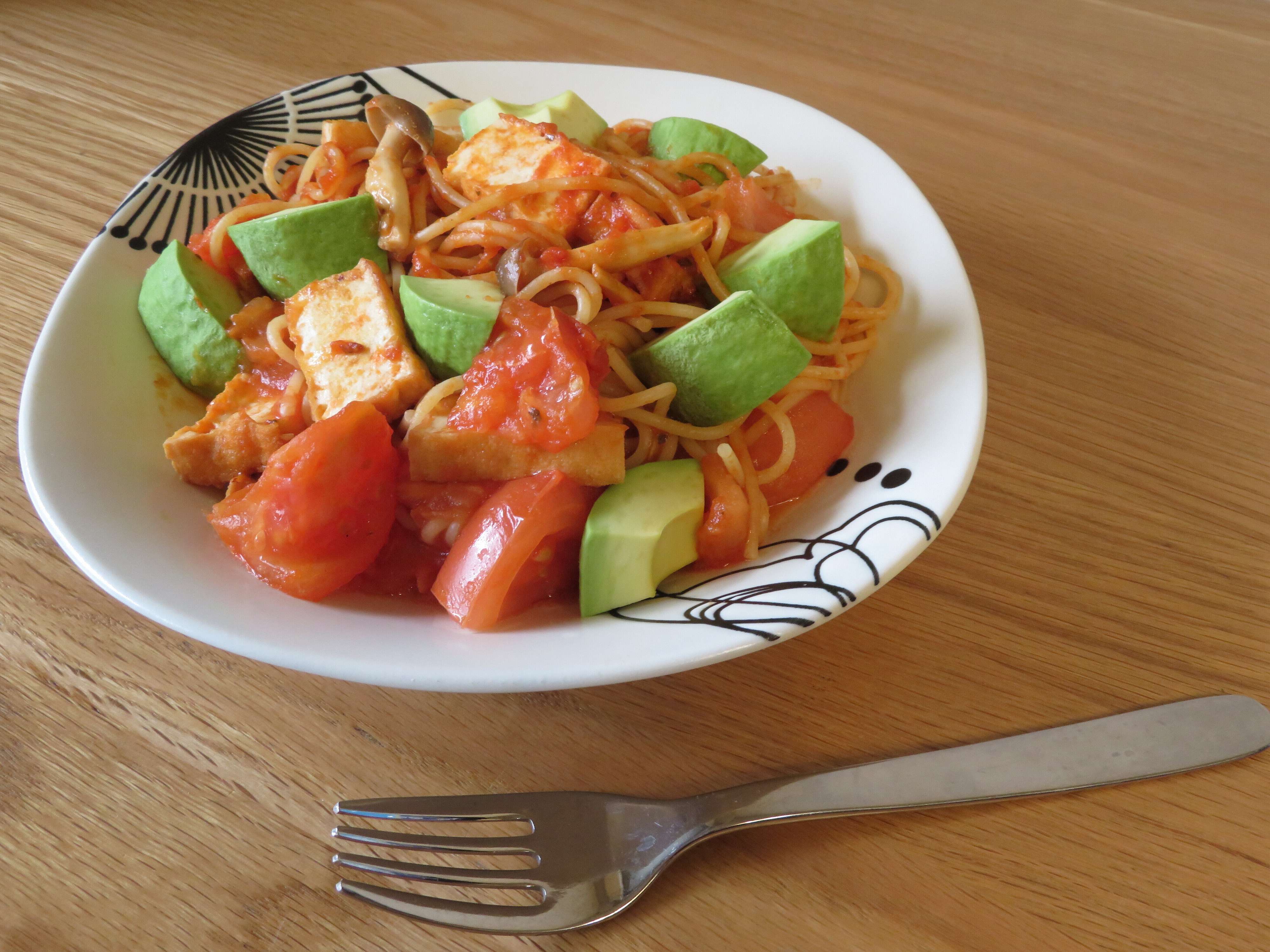 トマトソースのパスタ(ブナシメジ、厚揚げ、トマト、アボカド)