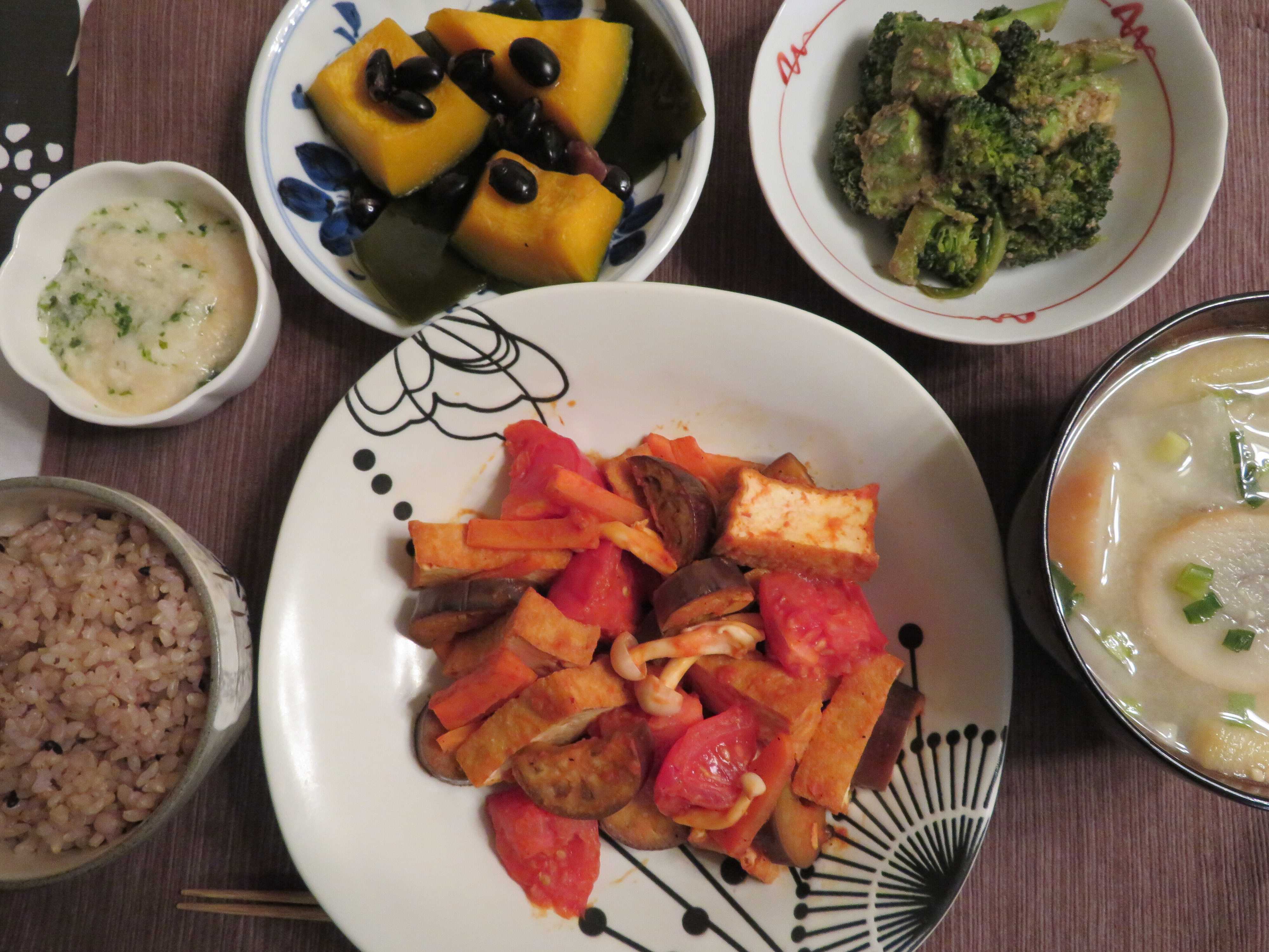 厚揚げ、ナス、ニンジン、ブナシメジのトマト炒め