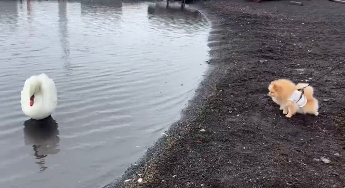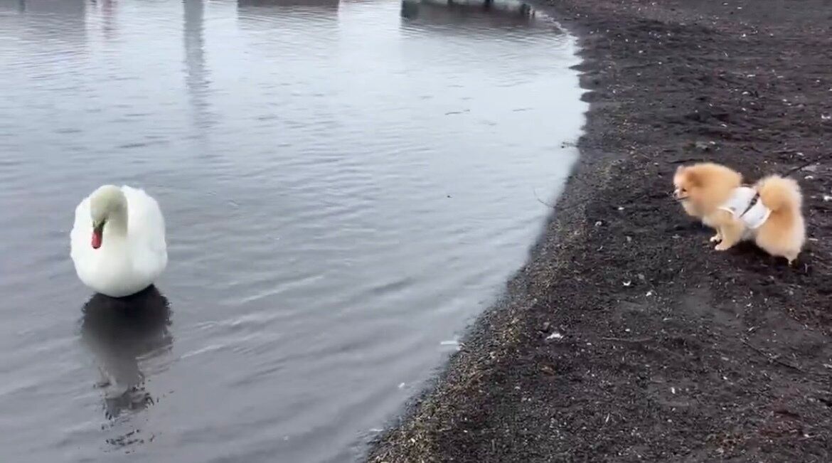 白鳥に気付くと、ピカルディくんはグイグイと近づいていったそうです。