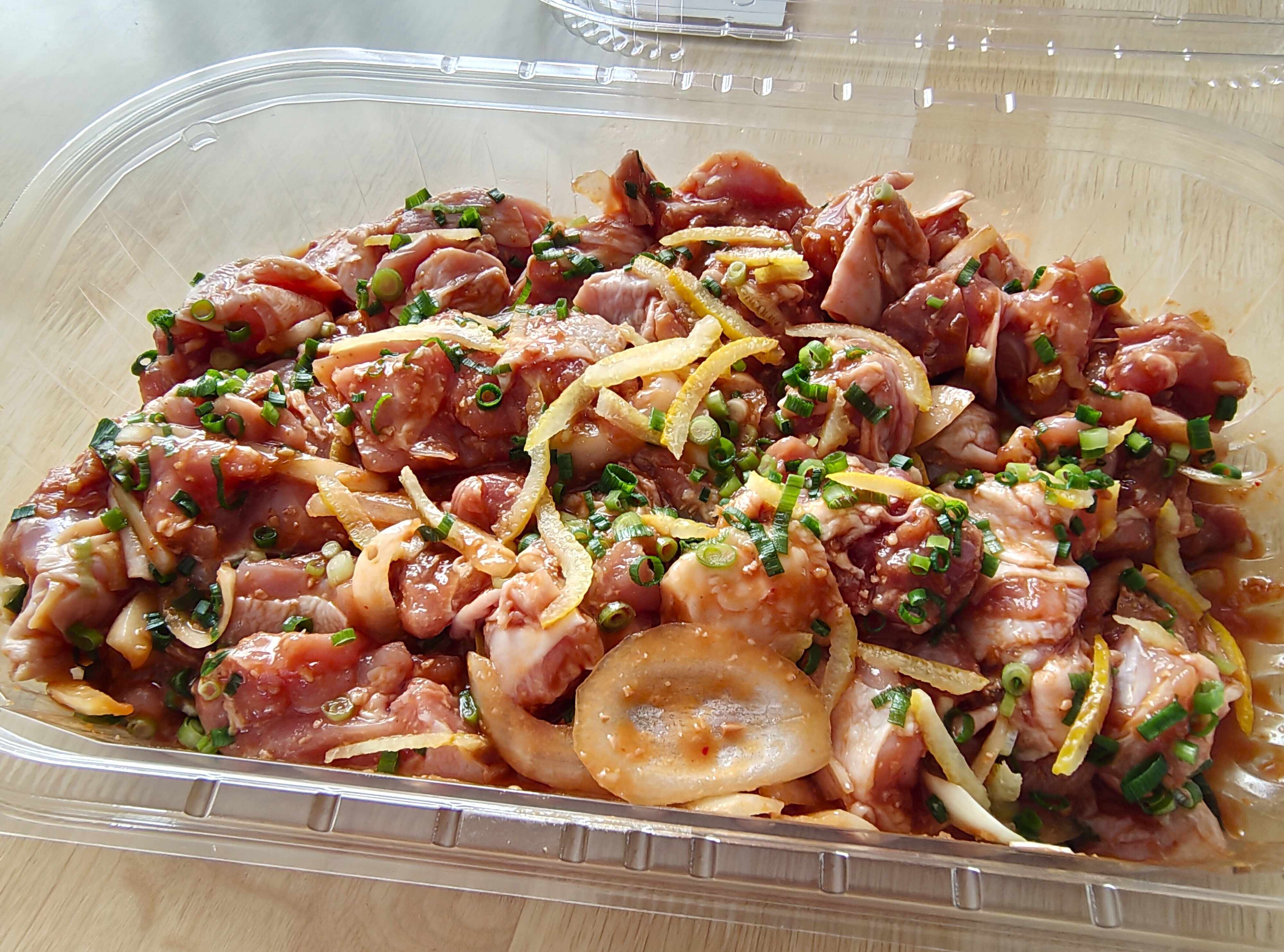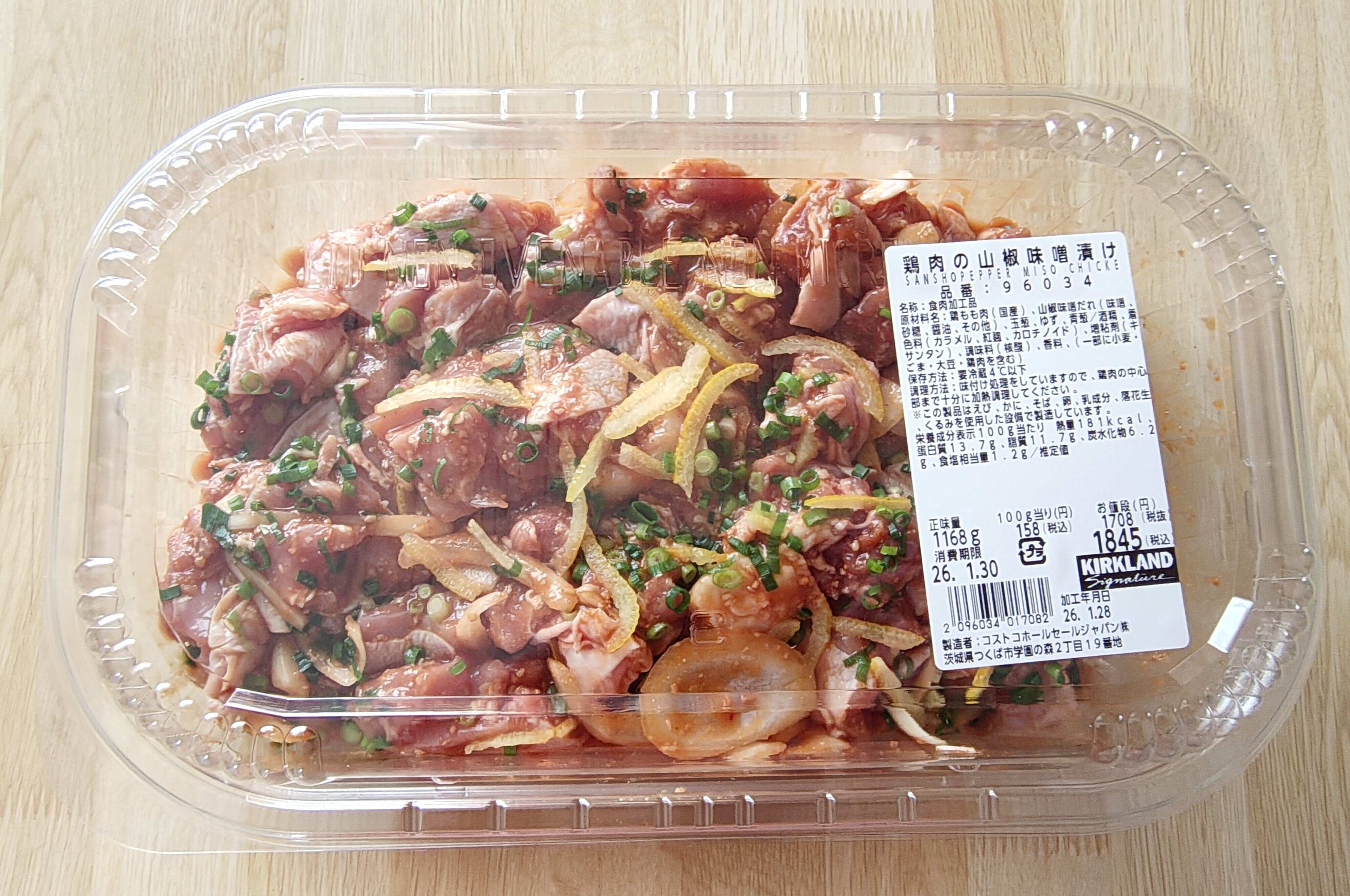 続いてコストコのデリコーナーに登場した「鶏肉の山椒味噌漬け」。こちらもグラム単位の販売となります。100gあたり158円で、1,800円~1,900円ほどのものが多かったように感じました。こちらは非加熱商品なので、しっかり焼く必要があります。