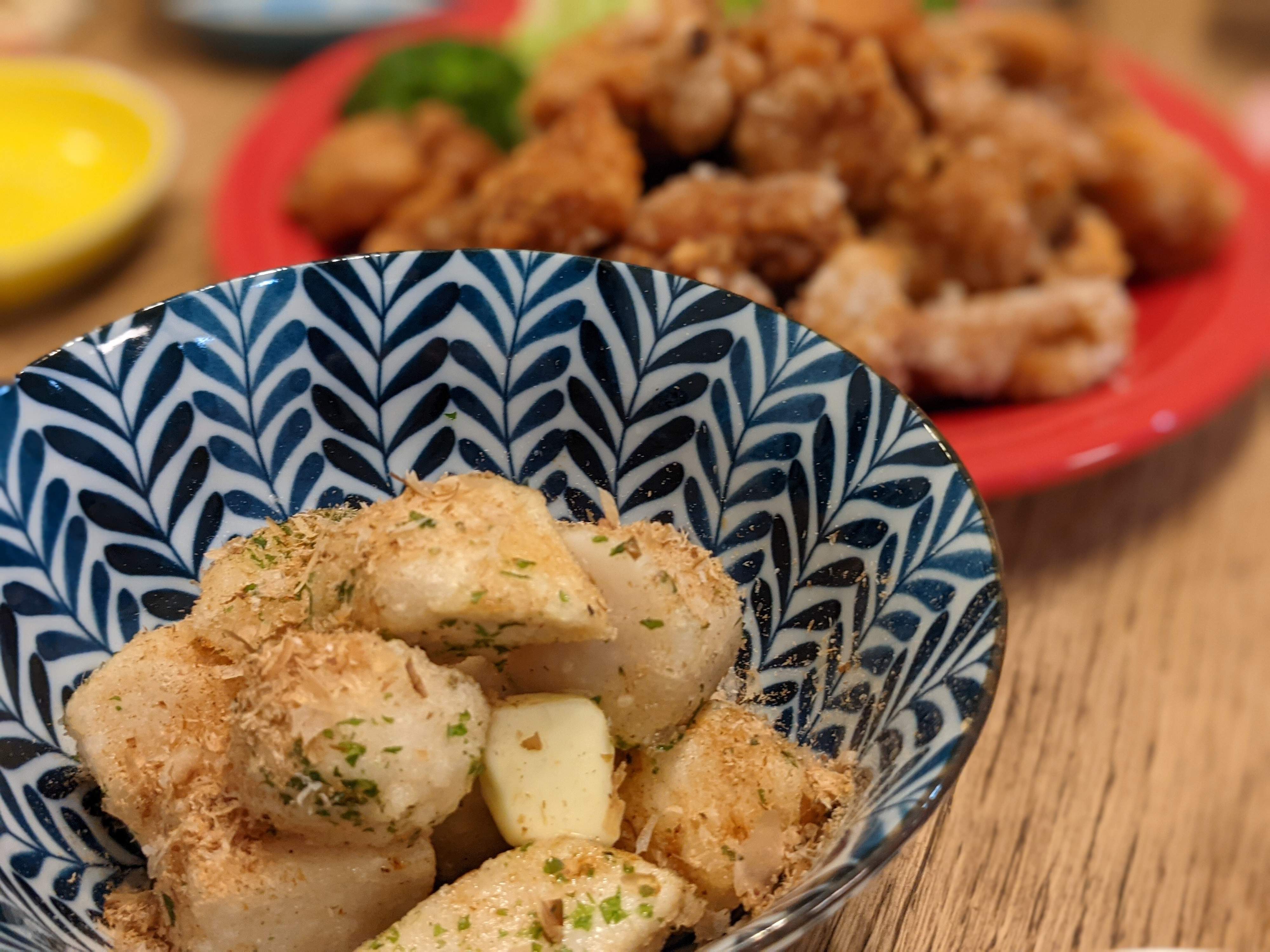 油でいい色になるまで揚げたら、塩を振って青のりと鰹節をまぶして出来上がり。